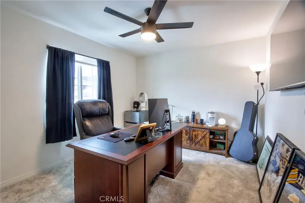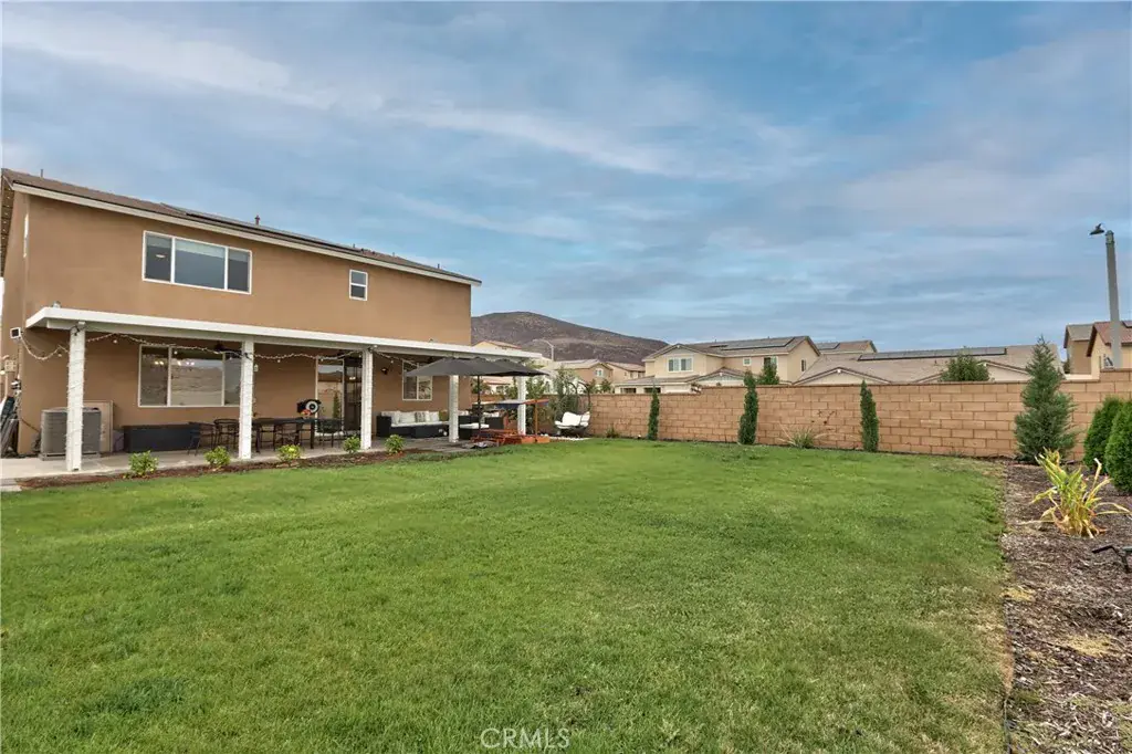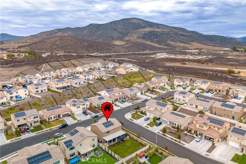 Turnkey 4-Bedroom Home with Designer Upgrades in Temecula – PAID FOR SOLAR, Built in 2022. Welcome to this move-in ready home located in Winchester and is located in the highly desirable Temecula school district. Built in 2022, this spacious 4-bedroom, 3-bathroom home offers 2,590 sq ft of modern living space on a large pool-sized corner lot with ample guest parking. Step inside to find a custom designer accent wall with stylish light sconces. The open floor plan features a downstairs bedroom and full bath—perfect for multi-generational living or guests. The gourmet kitchen is a chef’s dream, featuring a large center island with seating, herringbone backsplash, walk-in pantry, plenty of cabinets for storage, gold hardware and faucet, and designer pendant lighting. The kitchen flows seamlessly into the great room, which includes a cozy gas fireplace with floating shelves and wood mantel, and a large sliding glass door that opens to the spacious backyard—ideal for indoor-outdoor living and entertaining. Upstairs, enjoy a large loft/family room, upstairs laundry room with storage, two secondary bedrooms, and a full bathroom with dual sinks and tub/shower combo. The luxurious primary suite includes a generous bedroom, double sink vanity, walk-in shower, and an oversized walk-in closet. The backyard is perfect for entertaining, with a large covered patio, fruit trees, block wall fencing, and plenty of space for a custom pool or garden. Additional Features: include