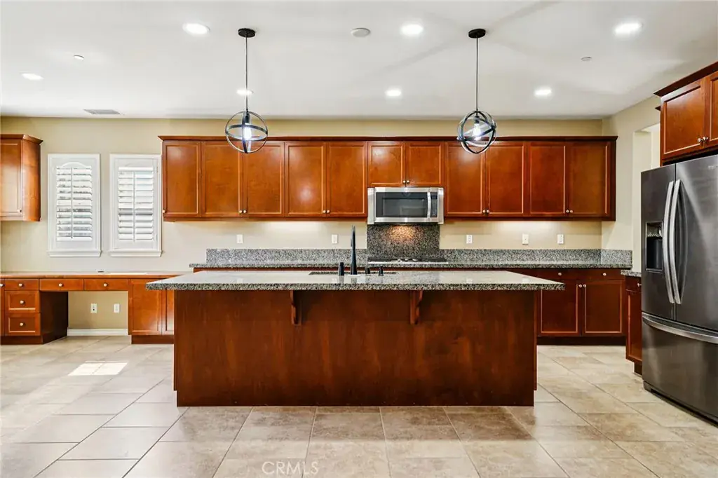 Designed for flexibility and comfort, the home features two private ensuite bedrooms, including one conveniently located on the main level—ideal for guests or multigenerational living. The open-concept floor plan highlights 9-ft ceilings, expansive windows, and a chef-inspired kitchen with granite counters, dual ovens, stainless steel appliances, and a large center island overlooking the great room.