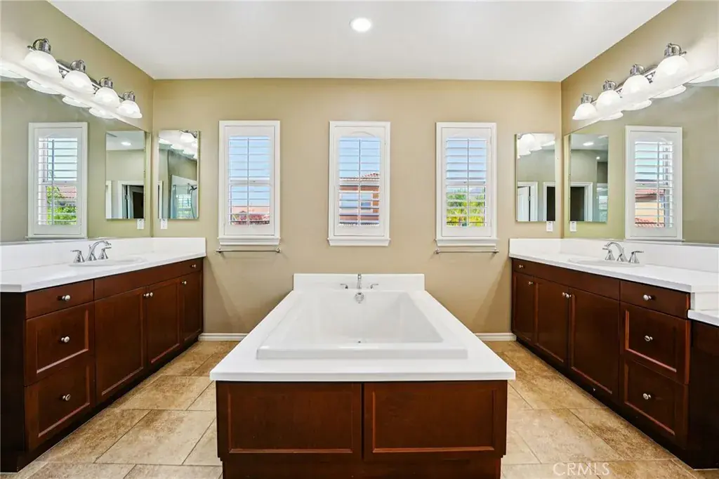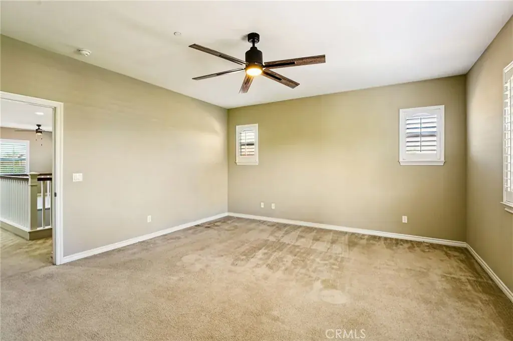 Additional spaces include a downstairs office (optional 5th bedroom) and a spacious upstairs bonus room perfect for a media space or second family area. Throughout the home, plantation shutters, ceiling fans, and cool tile flooring create an inviting and energy-efficient environment.