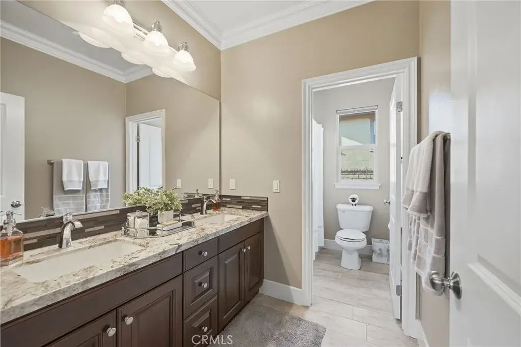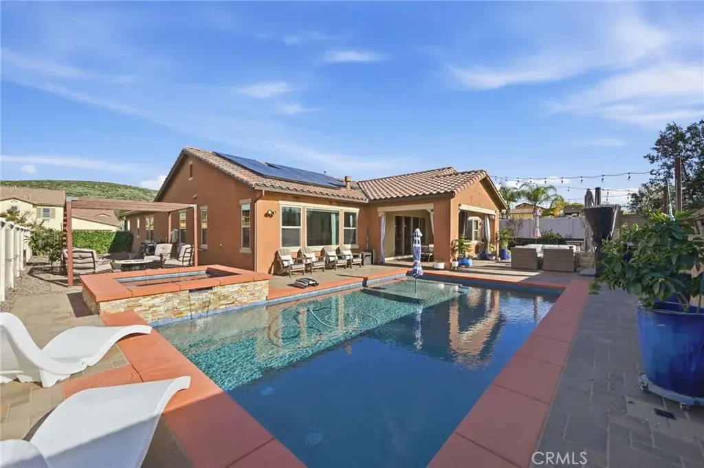 IMMACULATE SINGLE STORY, POOL HOME W/ FULLY PAID SOLAR!! Welcome to this highly upgraded single-story 3-bedroom + den/office home, thoughtfully designed for both everyday living and effortless entertaining. From the moment you step inside, you’re greeted by upgraded tile flooring and crown molding throughout, creating a clean, seamless flow across the entire home. The spacious great room serves as the heart of the house and connects to the outdoors through the expansive sliding glass doors, flooding the space with natural light. The kitchen and living areas open to a covered California room, perfect for indoor-outdoor living year-round. The primary suite is your personal sanctuary – bright, peaceful, and perfectly positioned for privacy. Large windows and a ceiling fan enhance the serene atmosphere, while the en-suite bathroom invites you to slow down with a center soaking tub, dual vanities, and a spa-inspired walk-in shower serving as your own retreat at the end of the day. Step into your private backyard oasis featuring a sparkling pool and spa, low maintenance landscaping, built-in BBQ, generous side yard, and a stunning stone fire pit accent wall that anchors the space for cozy evenings and entertaining under the stars. This home is upgraded throughout and includes fully paid solar with three battery packs, a 3-car tandem garage with EV charger, and smart, energy-efficient features that offer both comfort and peace of mind. Located in the highly rated Temecula School District, just minutes from parks, shopping, and dining, with low HOA dues. This home is stylish, functional, and designed for modern California living – all it needs is YOU.