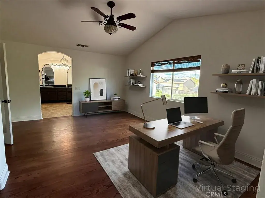 Nestled on a peaceful cul-de-sac in the heart of Winchester, this stunning Transitional-style residence offers the perfect blend of comfort, elegance, and modern living. Step through the double-door entry into soaring vaulted ceilings that grace the formal living and dining rooms. Engineered hardwood floors, plantation shutters, and abundant natural light create a warm and welcoming atmosphere throughout.