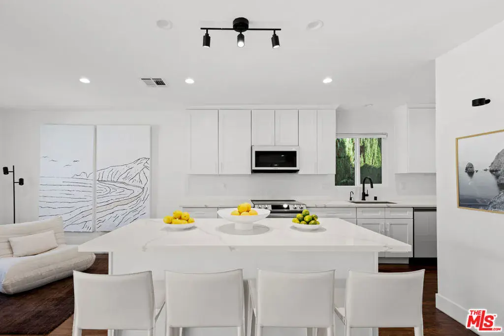 Located in a quiet, sought-after Winnetka neighborhood, this immaculate 4-bedroom, 2-bathroom residence offers 1,742 square feet of meticulously remodeled, open-concept living space on a generous 6,000 square foot lot. From the moment you enter, the sunlit interior impresses with elegant dark wood laminate flooring, recessed LED lighting, and dual-pane windows that create a bright, airy atmosphere. Within the same breath, the kitchen features custom shaker cabinetry, a massive waterfall-edge quartz center island with breakfast bar seating, and premium stainless steel appliances including a new induction technology range and built-in microwave. Both bathrooms have been fully transformed with quartz-topped vanities and designer microcement tile, while the primary suite offers a luxurious walk-in shower with a built-in bench and custom glass enclosure. The wood paneled pool-table recreation room was previously used by the sellers as a sonically treated professional grade recording studio (many grammy nominated tracks were recorded here!), and all the sound proofing remains intact making it perfect for someone in film/tv looking for a great space for their home studio. Step out through the sliding glass doors to discover a private, resort-style backyard oasis designed for the ultimate California lifestyle and entertaining with your family and friends. This low-maintenance retreat features a sparkling free-form swimming pool and spa, a modern white pergola with an integrated fire feature. Or choose the second zen zone, out front yet within the walls of privacy hedging a secondary gravel-scaped conversation area with lemon tree and lounging area. The sellers completed major upgrades including a new roof in 2023, plus a full pool renovation with new plaster and tile, conversion to saltwater, and a brand-new $5,000 pool heating system. Additional upgrades include copper plumbing and Tesla solar panels, providing both efficiency and peace of mind. Perfectly situated near Pierce College and the world-class shopping and dining of Warner Center, this home offers easy access to the 101 Freeway and the Orange Line for effortless commuting.