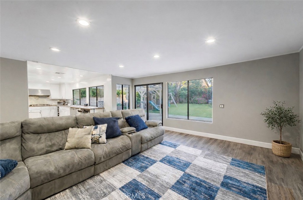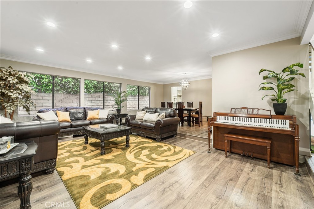 A welcoming double-door entry opens to bright, oversized living areas enhanced by recessed lighting, crown molding, and wide-plank wood-style flooring throughout. The formal living and dining areas flow seamlessly together, creating an ideal setting for gatherings and entertaining.