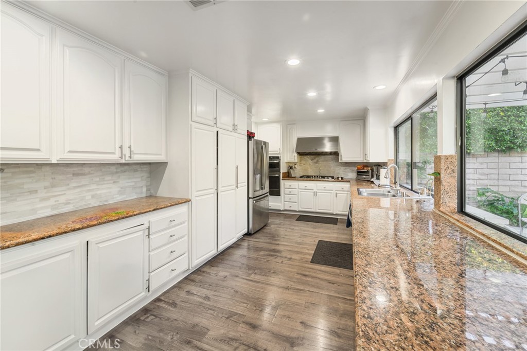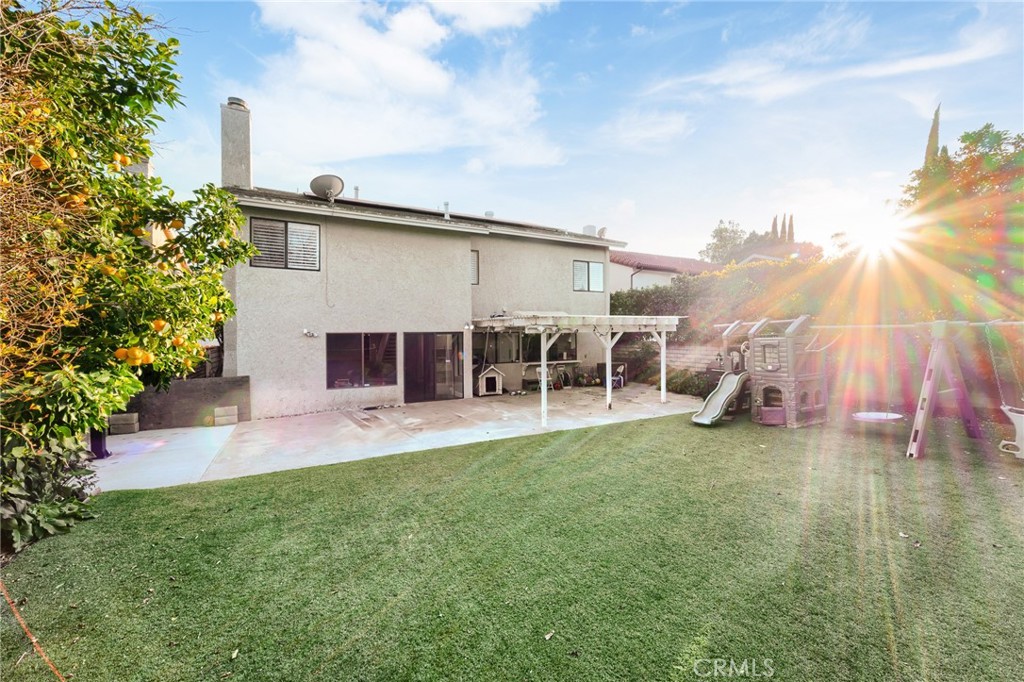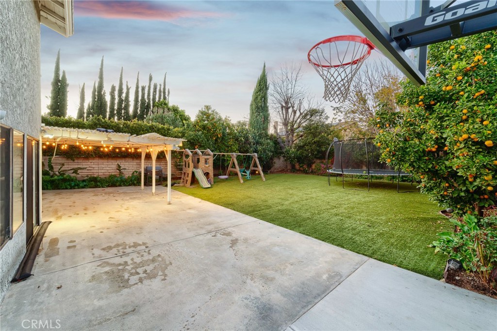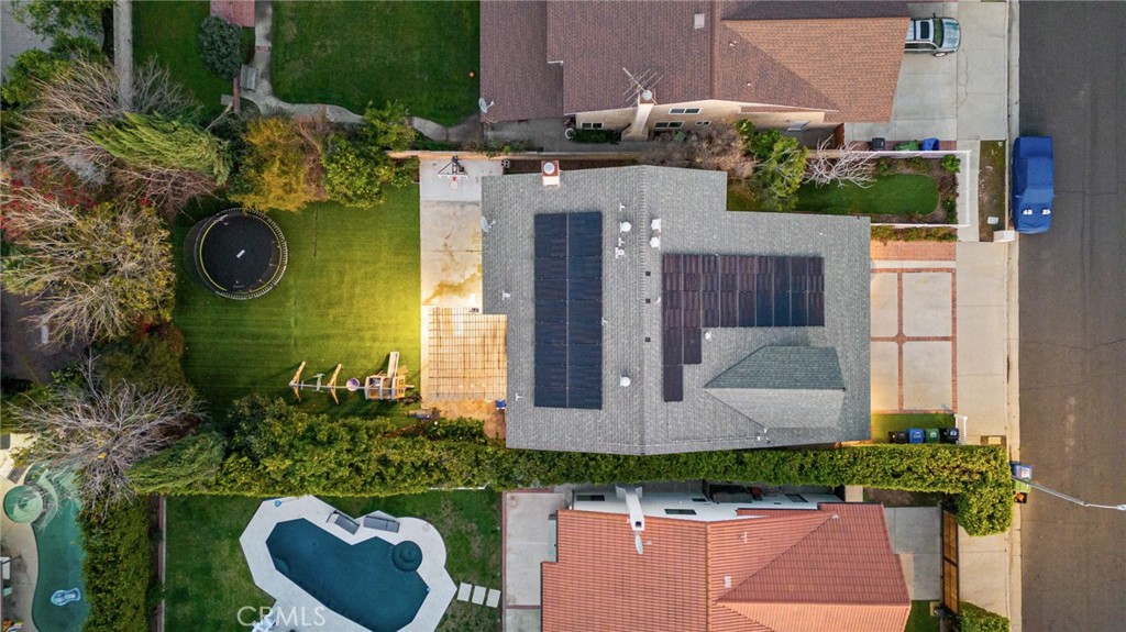 The spacious kitchen is appointed with granite countertops, abundant cabinetry, stainless steel appliances, and an extended counter with bar seating overlooking the backyard. Large picture windows fill the space with natural light and offer views of the outdoor entertaining areas. A generously sized family room with a fireplace provides additional space to relax or host, while a downstairs bedroom with an adjacent bath offers flexibility for guests, in-laws, or a private home office. Upstairs, the expansive primary suite features ample closet space and a large ensuite bath with soaking tub, separate shower, and dual vanities. Additional bedrooms are well-proportioned, offering comfort and versatility. The backyard is designed for year-round enjoyment, featuring artificial turf, mature landscaping, a covered patio with string lighting, basketball hoop, and multiple areas for recreation and entertaining. Solar panels provide added efficiency and long-term savings. Ideally located near Westfield Topanga & The Village, Warner Center, Costco, Pierce College, and local parks, with convenient access to the 101 and 118 freeways, this home offers both space and connectivity in the heart of the West Valley. With nearly 3,000 square feet of living space and a prime cul-de-sac setting, 7,675 sqft expansive lot, this Winnetka residence delivers comfort, functionality, and lifestyle in one complete package.