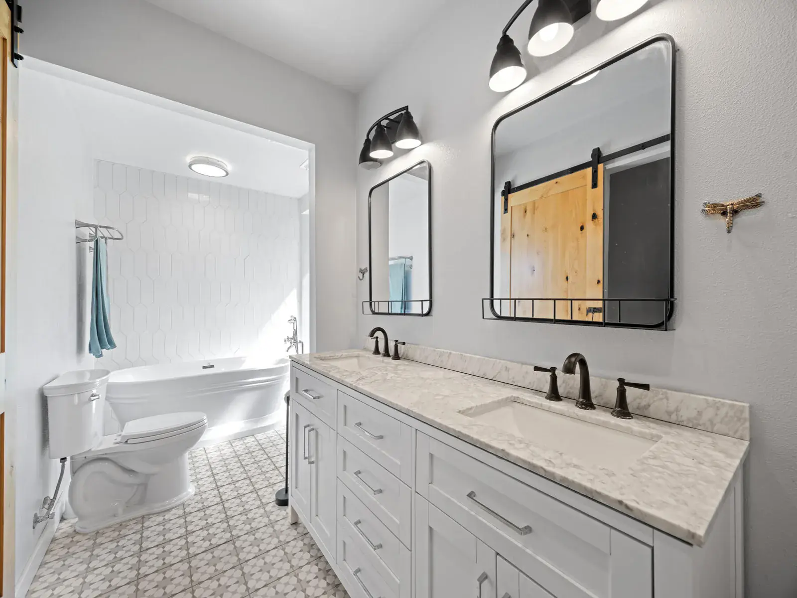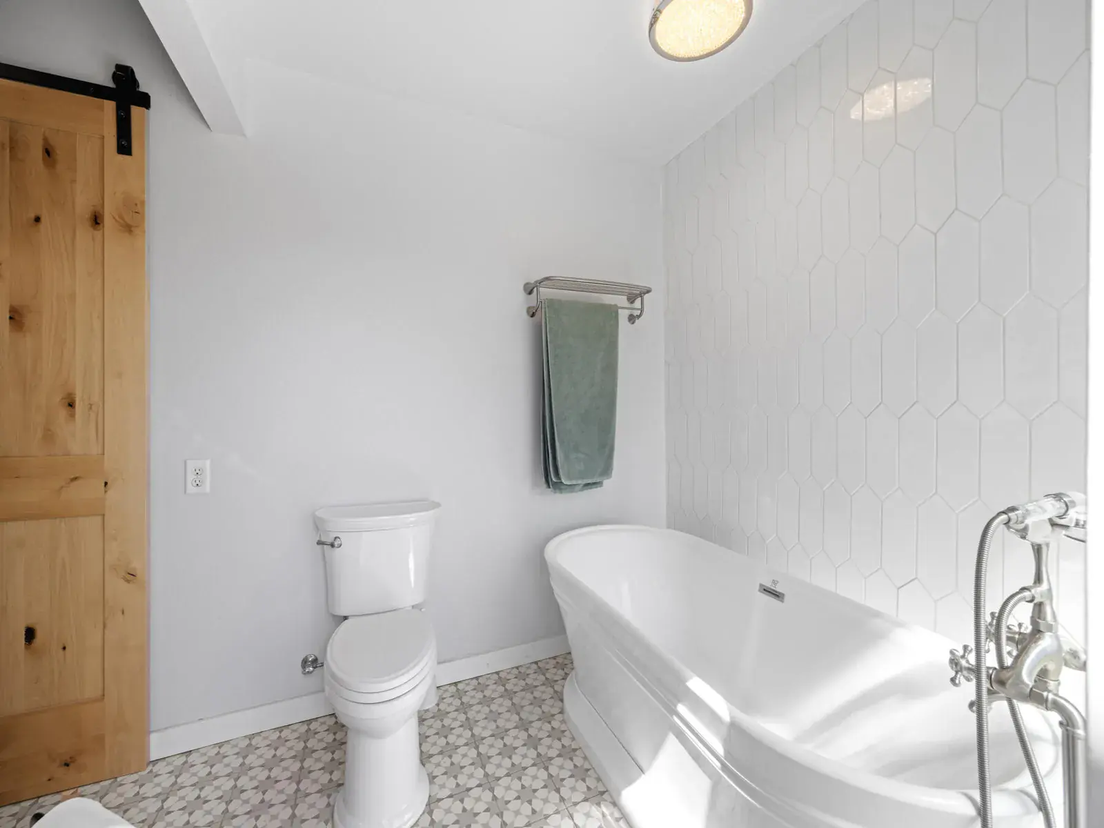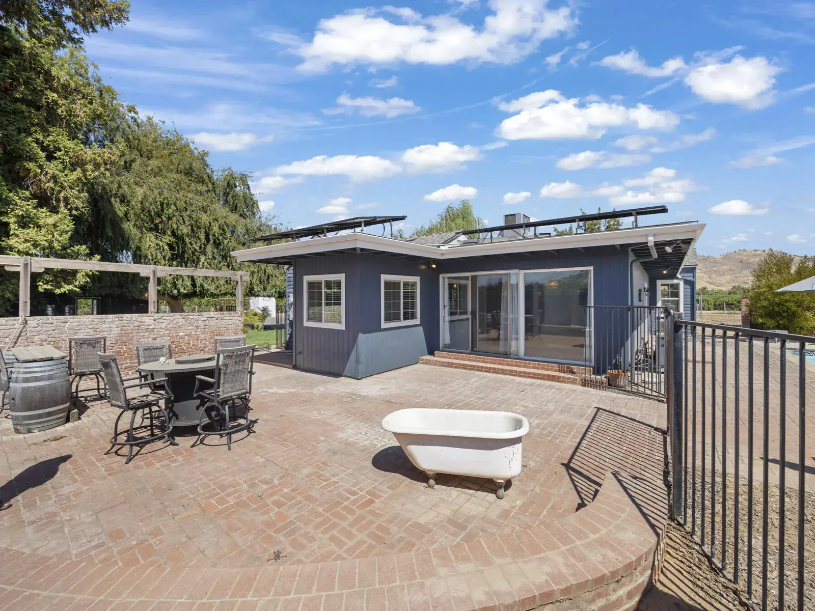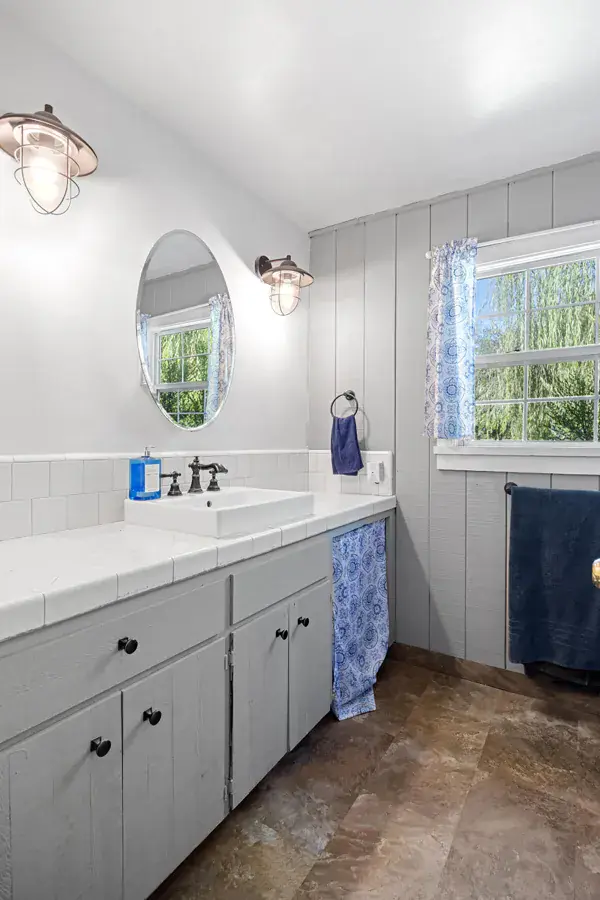 Additional highlights include a newer 30-year composition roof, updated HVAC system, and 28 oversized solar panels that keep your home energy-efficient year-round. The stylish bathroom with a soaking tub provides a serene retreat after a long day.