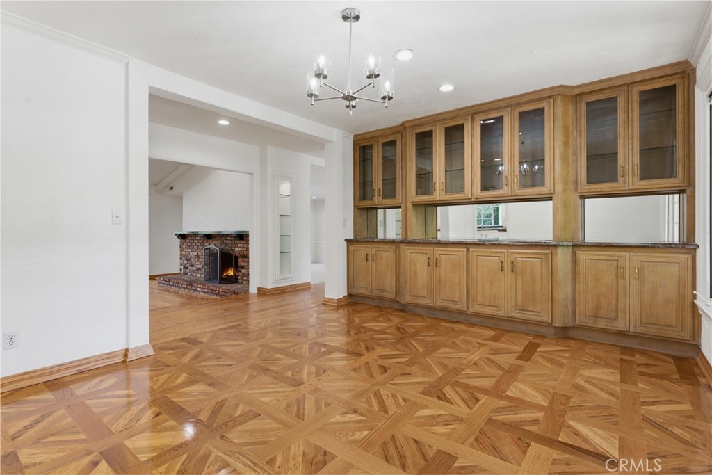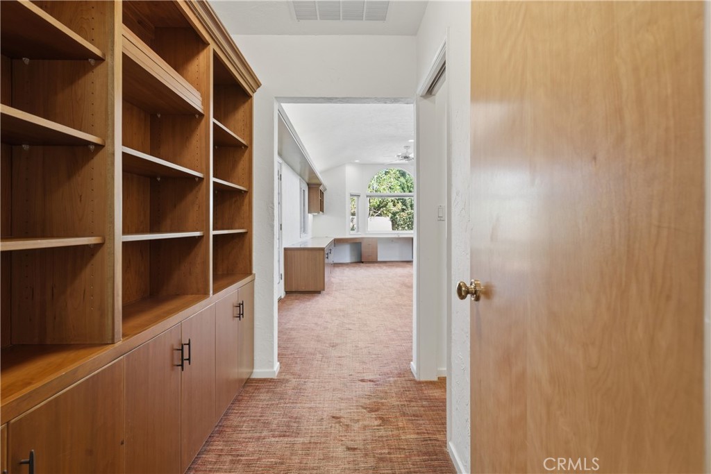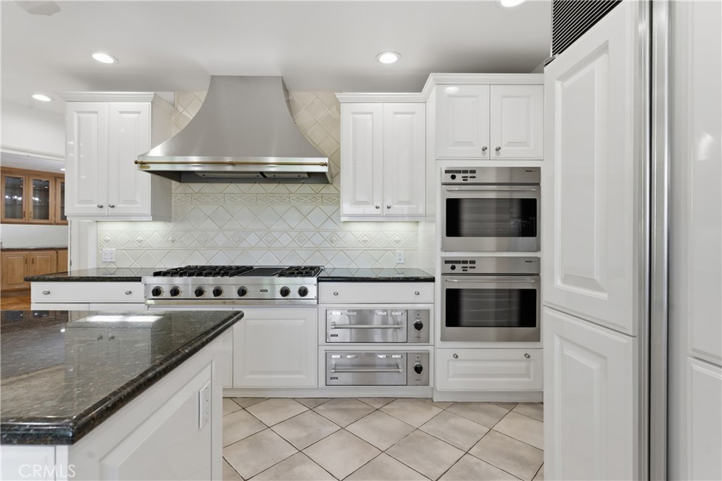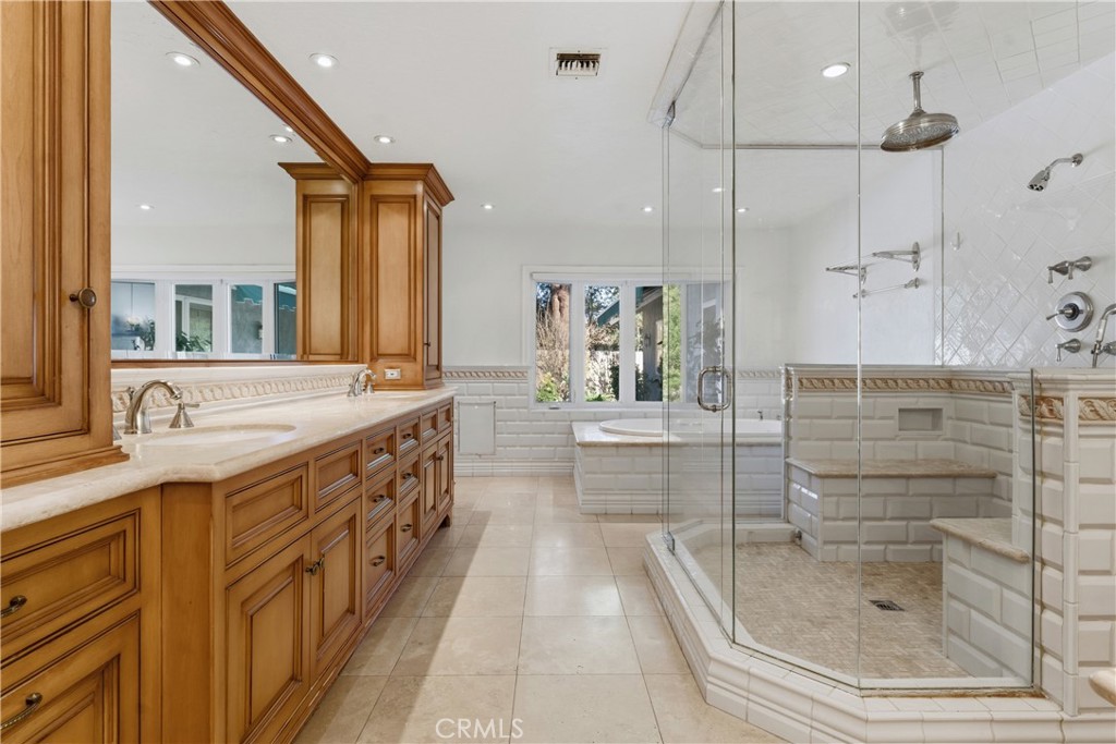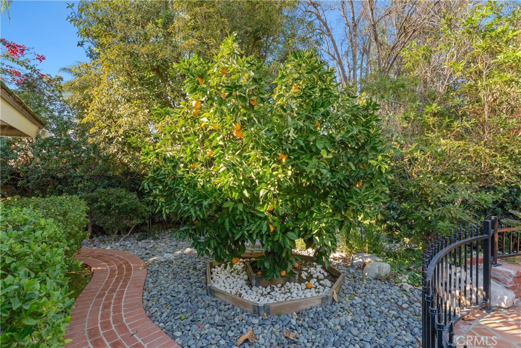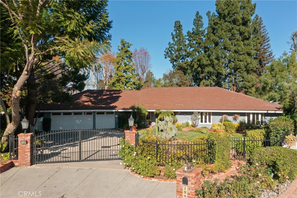 Sprawling single story approx. 4,700 SF gated estate located on a 19,000 SF flat lot South of the Boulevard in desirable Vista De Oro. On the market for the first time in over 30 years, the property sits at the end of a cul-de-sac behind an automatic security gate with separate pedestrian access. The spacious front yard has rolling front lawn with drought resistant landscaping, mature trees, & long driveway that leads to the 3-car attached garage with storage & direct access. A meandering brick pathway leads to the covered front porch with double door entry. Step inside to find a grand foyer with wood beamed tray ceiling, coat closet, & convenient guest powder bathroom. Formal living room has brick fireplace, wood product walls, crown moldings, & French doors that open to backyard. Separate family room features vaulted wood beamed tongue & groove ceiling, brick fireplace, built-in display & storage cabinetry, & French doors that open to the yard. Formal dining room has buffet counter with custom cabinetry, gorgeous parquet wood floors, and large picture windows overlooking the exterior. Chef’s upgraded kitchen features large center island, stainless appliances including Miele double ovens, Subzero refrigeration, Viking 6-burner stove + grill, two warming drawers, walk-in pantry, & separate breakfast room with built-in bench seating and expansive storage cabinetry with counter space. Grand primary suite boasts double door entry, French doors that open to the backyard, built-in storage, two bedroom-sized walk-in closets with custom built-ins, and luxurious en-suite upgraded bathroom with dual vanities + separate makeup counter, stone counters, large walk-in shower with dual bench seats & raindrop shower head, & separate spa tub with jets. Attached to the primary is a massive bonus room providing ideal flex space for office/gym/5th bedroom featuring French doors that open to the yard, large walk-in closet, and built-in desks with storage. There are three additional secondary bedrooms, two share a large bathroom with walk-in shower and the third has access to its own bathroom with shower & tub. There is also a laundry room with storage and exterior access. The entertainer’s backyard boasts swimming pool, large covered pergola for outdoor dining, separate Saltillo tiled patio with BBQ center, and lush landscaping with grass lawns and fruit trees. Adjacent to Westfield Topanga Mall/Village, Warner Center, parks/hiking trails, & easy access to the beach/freeways.
