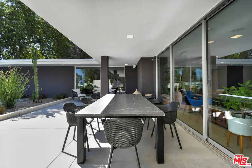 Mid-Century Modern. Palm Springs Soul. Woodland Hills Views. Experience the essence of elevated California living in this exquisite single-story Mid-Century retreat, reimagined with sophisticated Palm Springs energy. Privately gated and perfectly sited on a premier 26,000 sq. ft. pad, this 4-bedroom, 5-bath architectural showcases a seamless harmony between timeless design and relaxed luxury. Step inside to a sunlit great room where clean lines and curated textures create an atmosphere of modern serenity. The open living area unfolds effortlessly a fireside lounge, TV retreat, dining space, and a chef’s kitchen designed for connection and flow. Walls of glass invite the outdoors in, revealing panoramic treetop and city-light views. The backyard is pure California magic a sparkling pool and spa, firepit, multiple patio lounges, and a conversation outdoor bar framed by desert-inspired landscaping and views of the mountain’s and city lights beyond. It’s the ultimate entertainers’ oasis. The chef’s kitchen stands as a contemporary showpiece, featuring Wenge cabinetry, artisan glass backsplash, premium stainless appliances, and an 8-foot waterfall island that anchors the open-concept design. The bedroom wing features a tranquil primary suite captures resort-style living, with sliding glass doors opening to the private outdoor retreat. The sumptuous primary bath is bathed in natural sunlight and offers an oversized dual-head shower, deep soaking tub, and elegant double vanity. From here, sliding glass doors lead to a serene grassy lawn shaded by mature trees, a perfect space for meditation, morning yoga, or quiet reflection. Every detail has been thoughtfully curated, Porcelanosa and Italian tile bathrooms, hand-stained solid doors, custom aluminum windows, and wide-plank engineered hardwood floors. The gated drive provides ample guest parking and sports court for recreation. A rare opportunity to own an architectural statement revived for today’s lifestyle timeless Mid-Century design meets relaxed California luxury in one of the most coveted south-of-the-Boulevard locations.