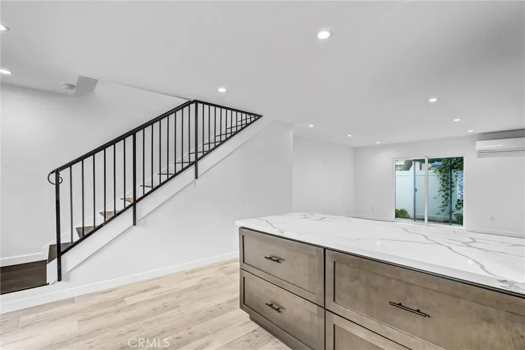 The main level features a bright and open living area alongside a sleek, modern kitchen complete with quartz countertops and contemporary finishes. Both bedrooms are thoughtfully situated upstairs, providing separation and privacy from the main living space.