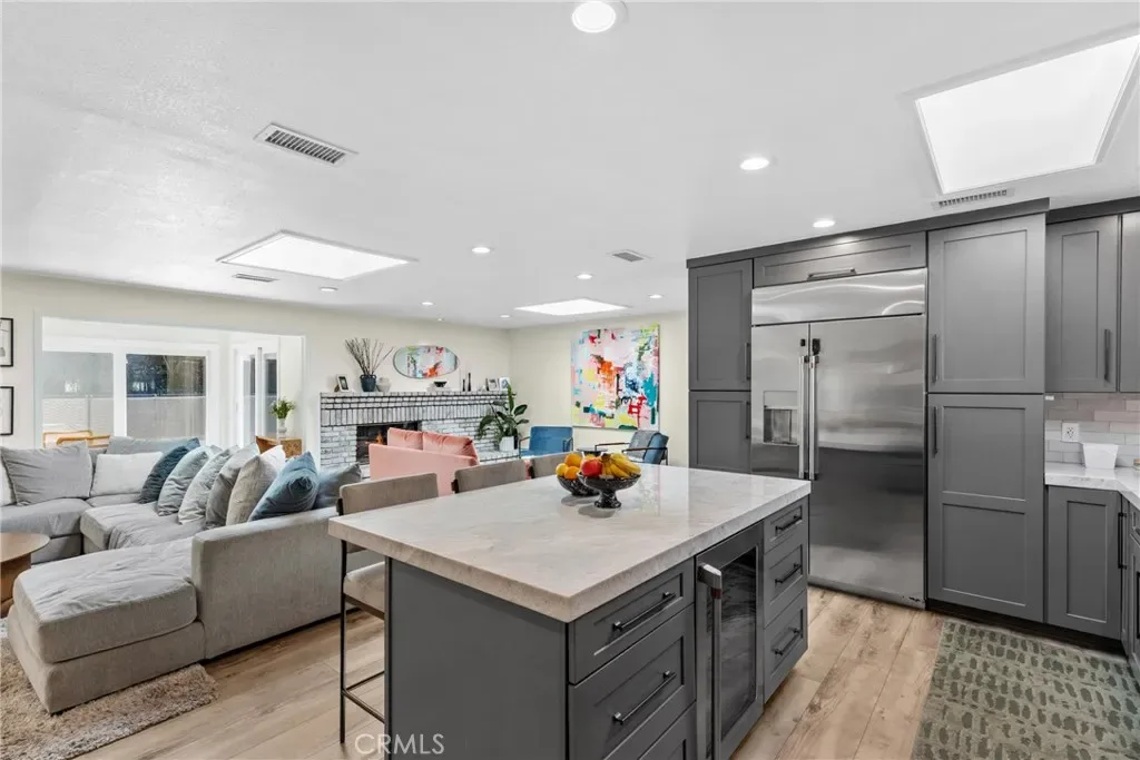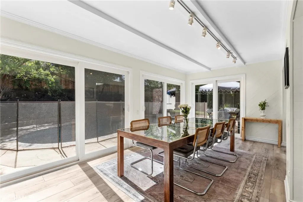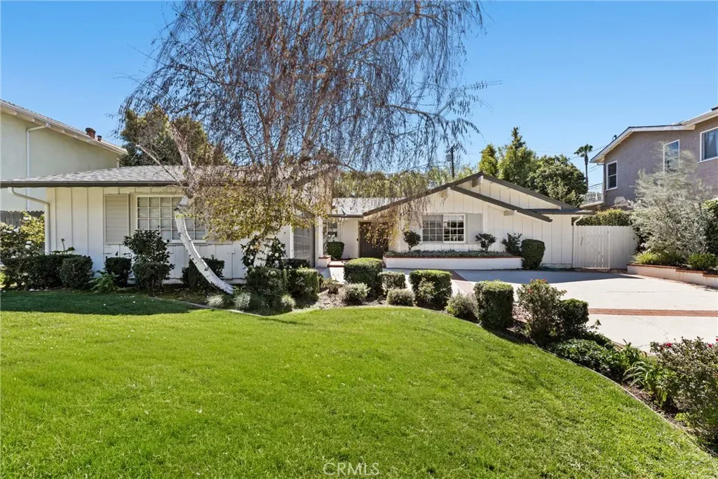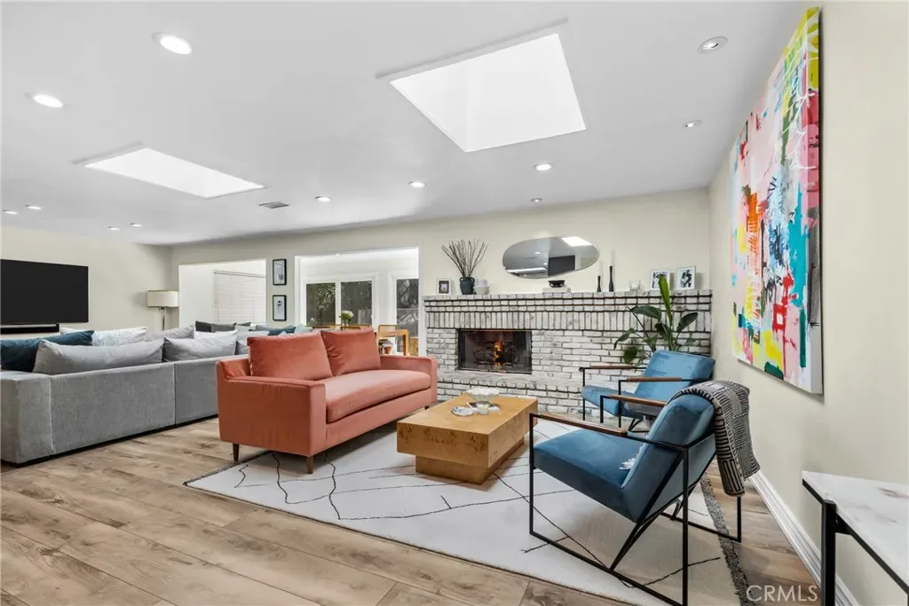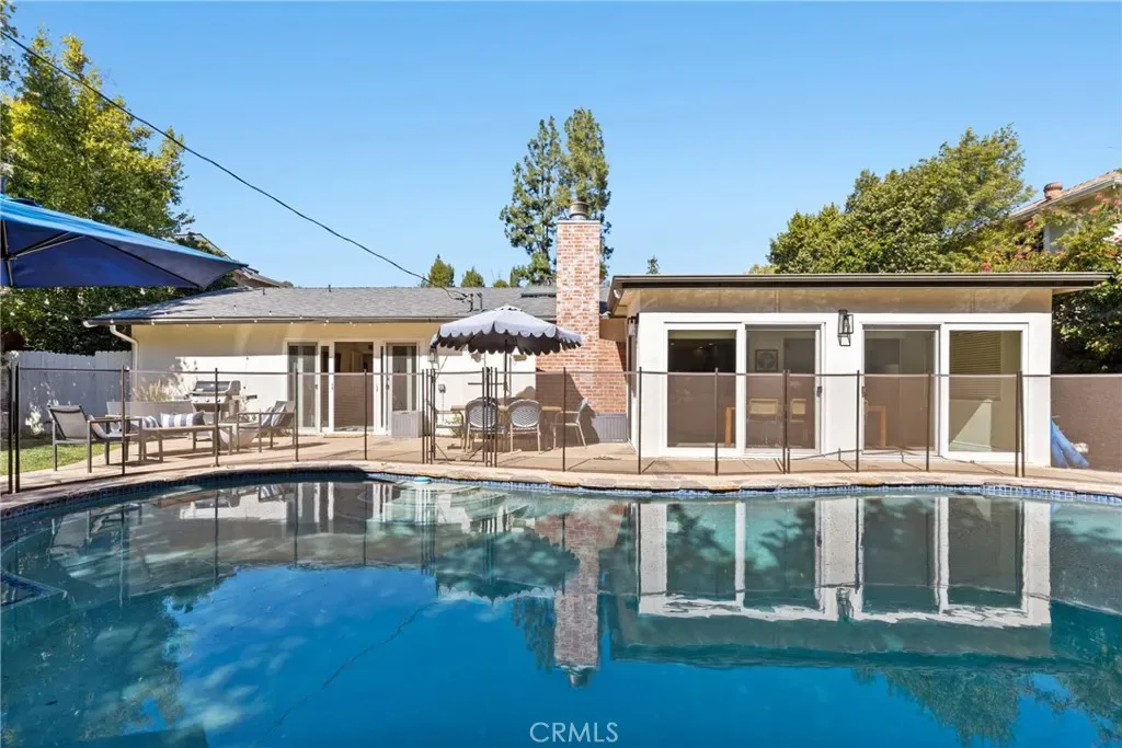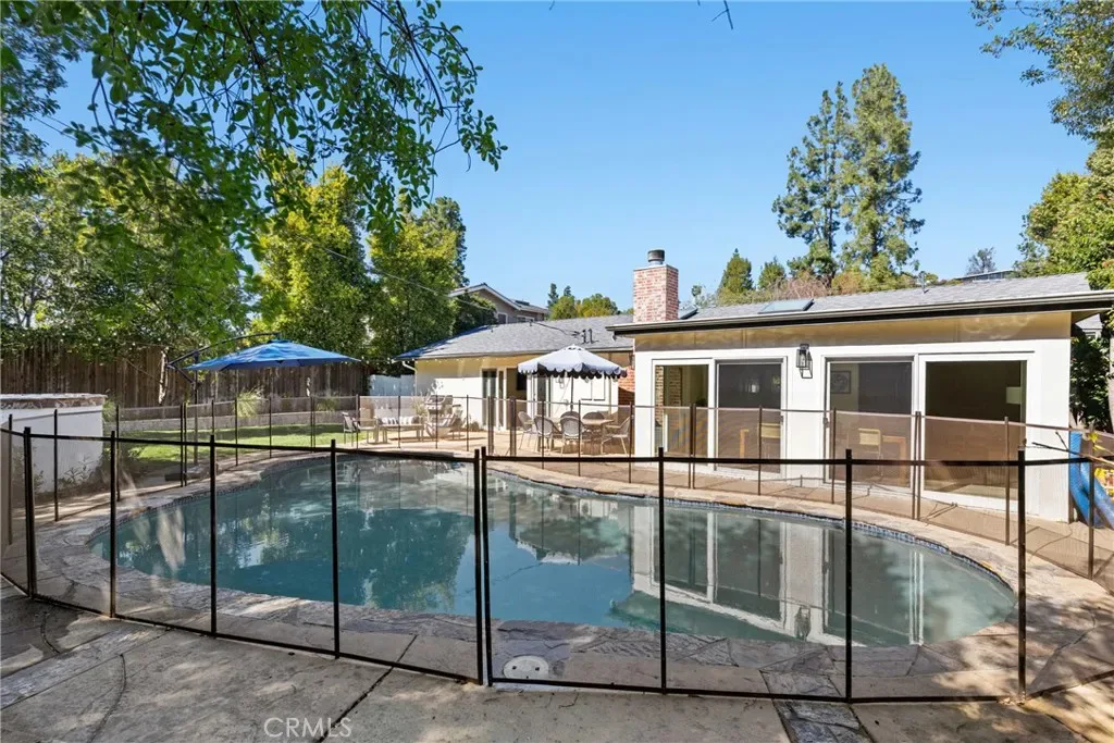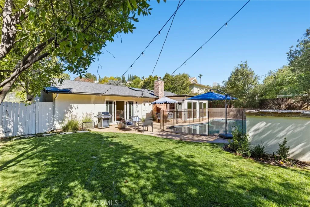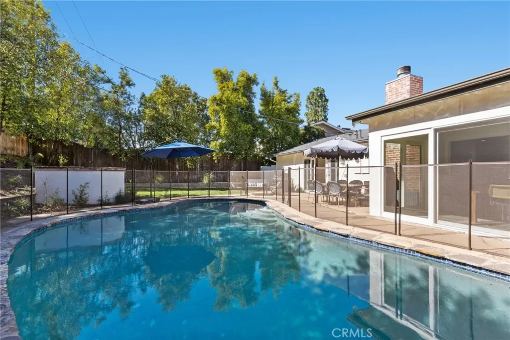 Welcome to this bright and airy single-level home with an open floor plan, located south of the boulevard in prime Woodland Hills, adjacent to Calabasas. Light-filled living, dining, and family rooms with multiple skylights create an ideal space for entertaining. This home offers 4 bedrooms, 2 remodeled bathrooms, and approx. 2,107 sq ft of living space. The newly remodeled kitchen features a large island, wine fridge, 1 oven + 1 speed oven/air fryer/microwave, and soft-close cabinetry. The dining area overlooks the backyard and pool, framed by a full wall of windows. Enjoy a private, tree-lined yard with patio, lawn, and a sparkling pool. The spacious primary suite includes a vanity, a large walk-through closet, sliding doors to the patio, and a fully remodeled en suite bathroom with high-end finishes. Additional features include an office off the kitchen with built-in shelving, built-in storage, indoor laundry (side-by-side), an attached garage, and a large driveway. Upgrades include a newer roof with updated framing, exterior paint and lighting, interior smart lighting system, and a smart irrigation system. Situated on a quiet street with sidewalks and great curb appeal. Close to top-rated schools, shopping, dining, and easy access to Topanga Canyon and the beaches. Amenities include gardening and pool service, side-by-side washer and dryer, and EV charger.