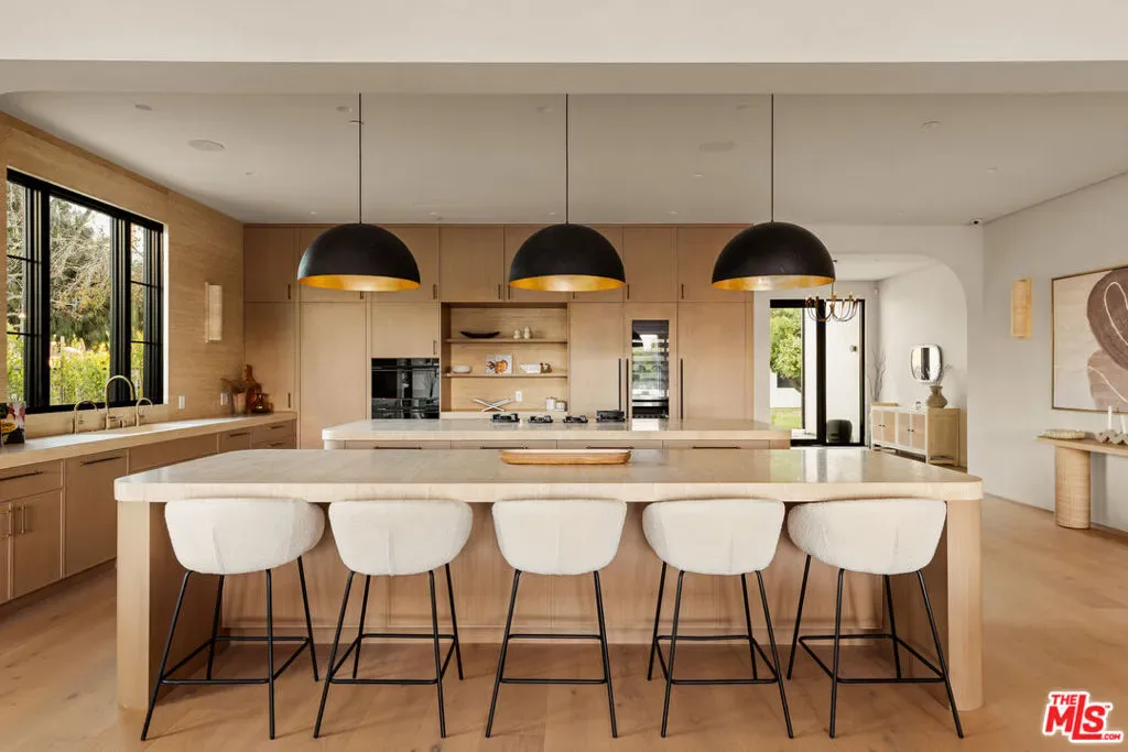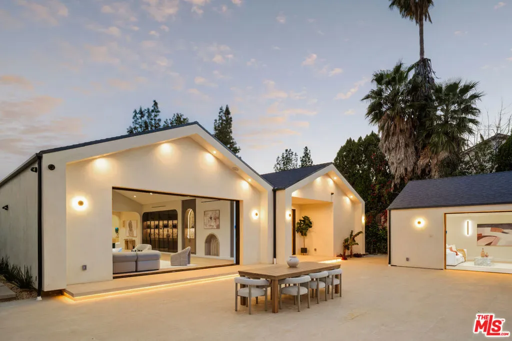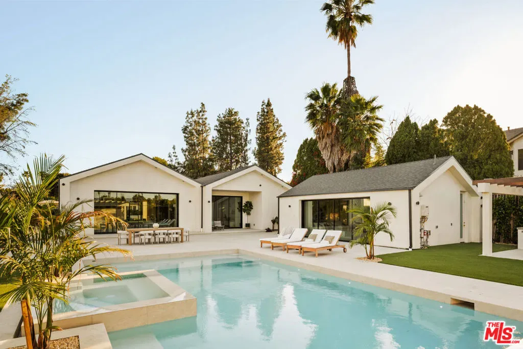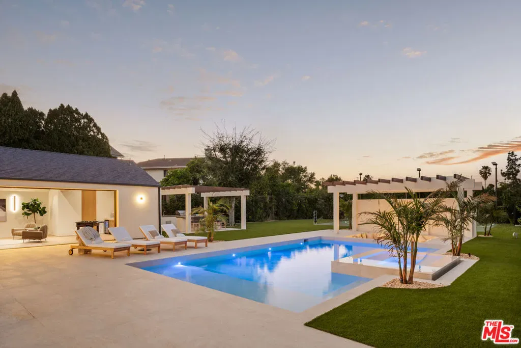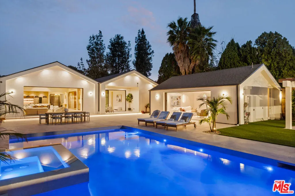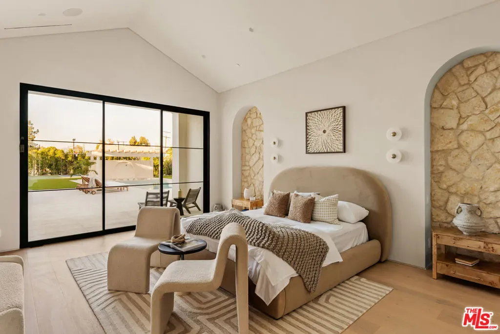 Elevated single-level resort-style residence blending warm natural textures with refined modern design. A soft neutral palette, custom millwork, arched architectural details, stone finishes, and wide-plank wood flooring create a cohesive, magazine-worthy aesthetic throughout. Vaulted ceilings with exposed beams and walls of glass fill the open-concept layout with natural light while creating seamless indoor-outdoor flow.The designer kitchen serves as the heart of the home, anchored by an oversized island with seating, integrated cabinetry, sculptural pendant lighting, and a dramatic stovetop feature wall wrapped in custom stone with a sleek vent hood delivering both striking design and everyday functionality.The approximately 4,000 sq. ft. residence offers four bedrooms and four-and-a-half bathrooms, including a luxurious primary suite designed as a private retreat. The spa-inspired bath features natural stone finishes, refined fixtures, soft ambient lighting, and dual walk-in closets. Secondary bedrooms and baths continue the home’s calm, elevated design aesthetic.Set on an approximately 18,000 sq. ft. lot, the backyard unfolds as a private resort-style oasis featuring a sparkling pool and spa with Baja shelf, a sunken fire pit lounge, expansive entertaining patios, and a private sport court. A detached guest house with a private bathroom offers ideal flexibility for guests, a home office, or creative studio.A rare single-level offering that seamlessly combines modern architecture, comfort, and resort-style living.