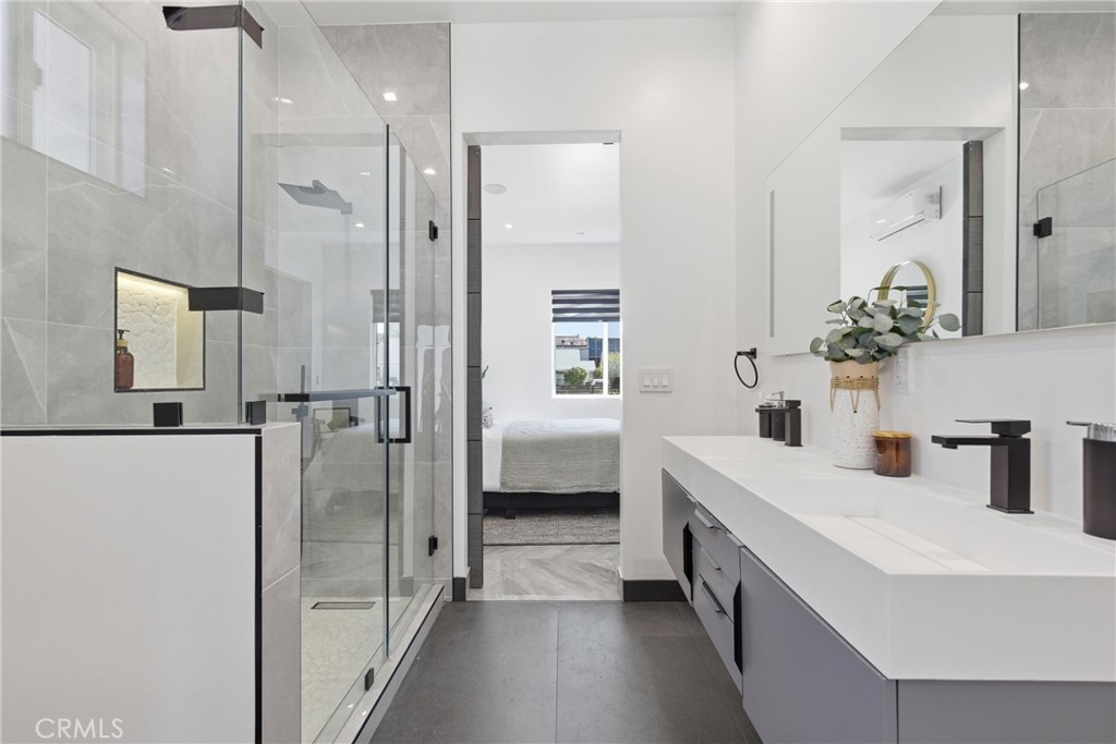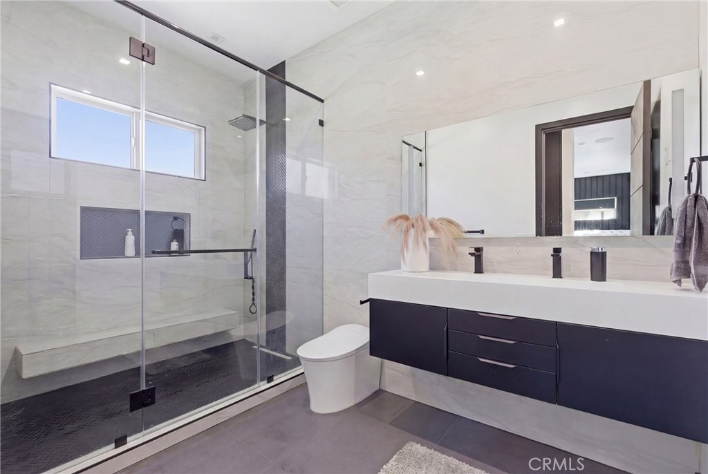 The home offers 5 bedrooms and 4 bathrooms, including a generous primary suite with a large walk-in closet and spacious bathroom with dual vanities and a walk-in shower.