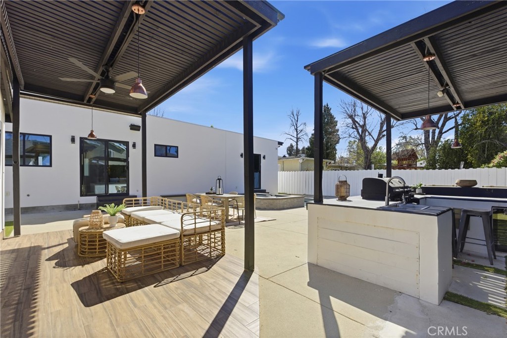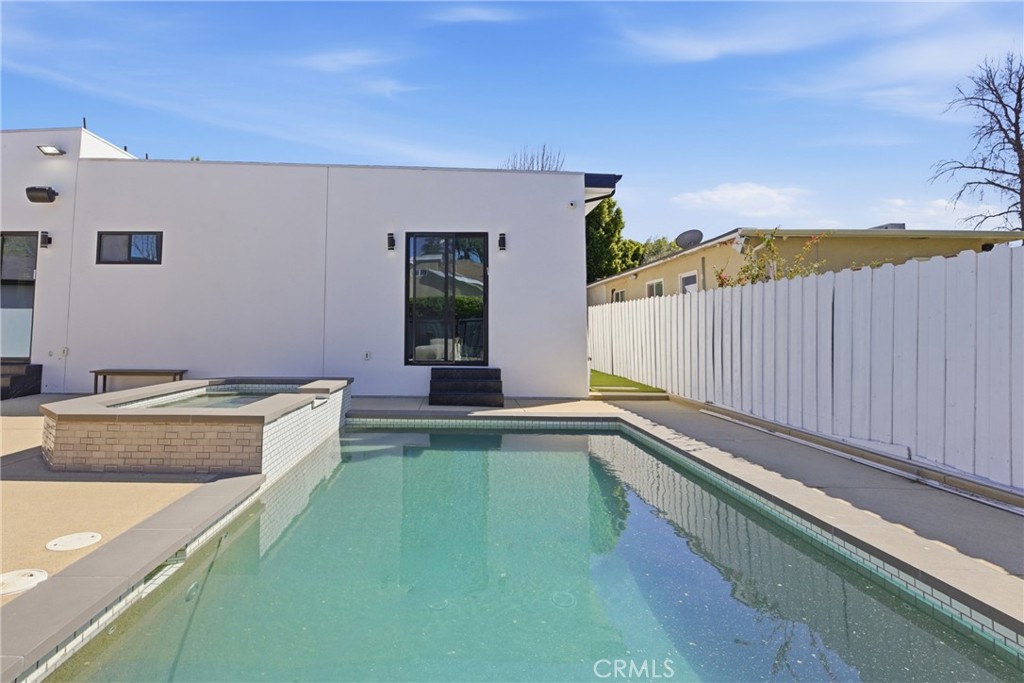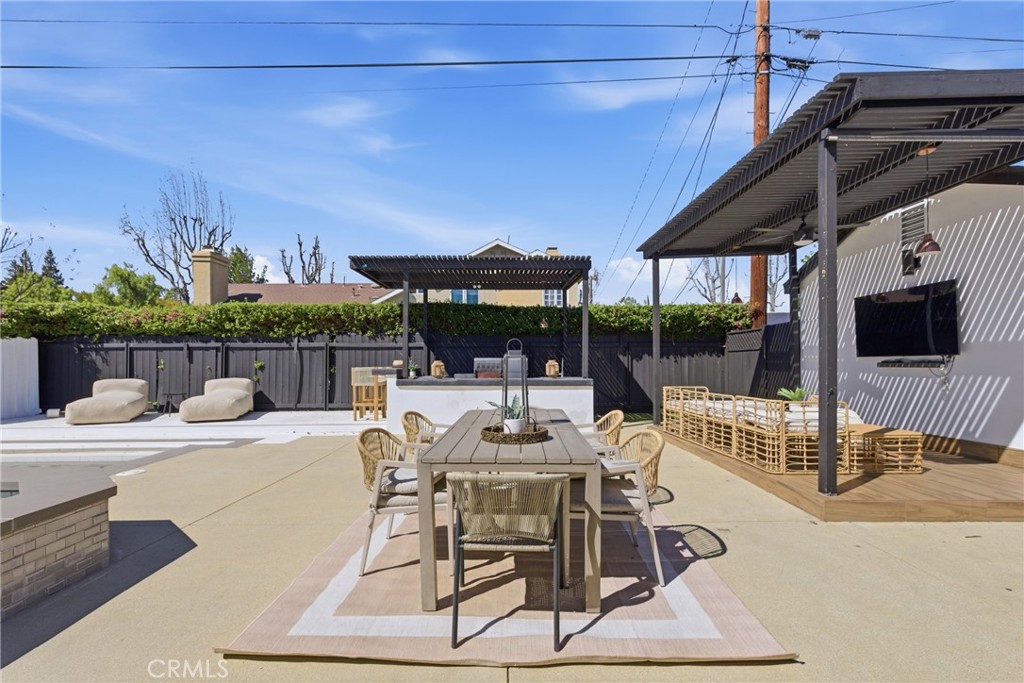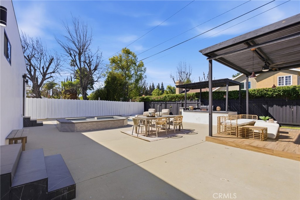 Step outside to the private backyard designed for entertaining, featuring a pool, spa, outdoor kitchen, and covered patio—perfect for gatherings or relaxing outdoors.