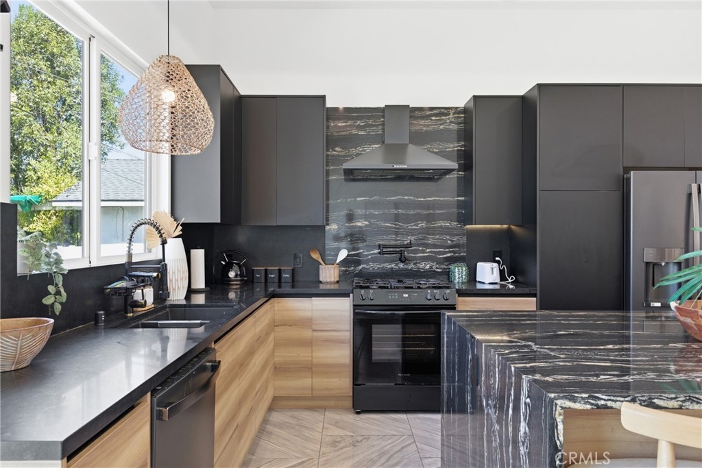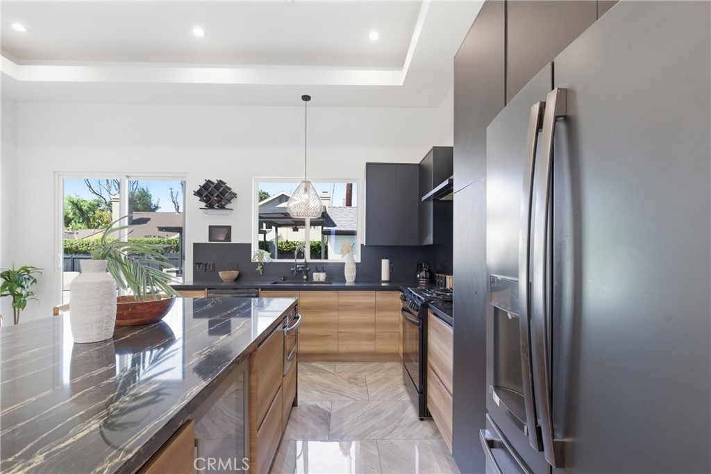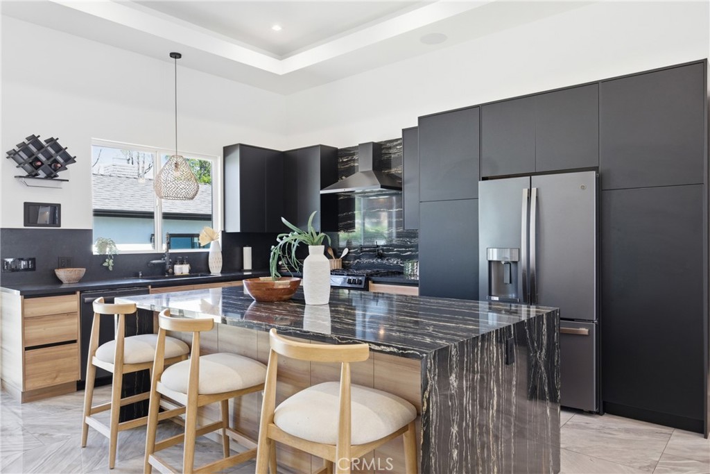 Inside, the spacious layout is filled with natural light and offers a seamless flow between the living room, dining area, and chef’s kitchen. The kitchen features custom cabinetry, quartz countertops, a large center island with breakfast bar, and high-end appliances, making it ideal for both daily living and hosting.