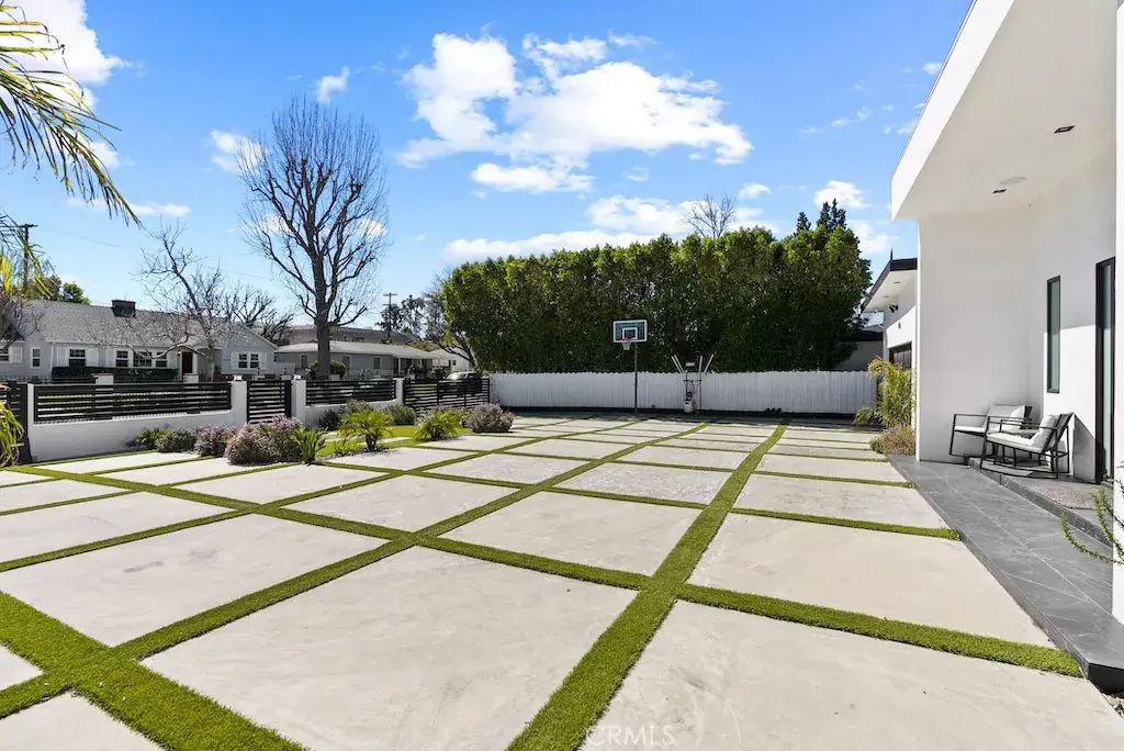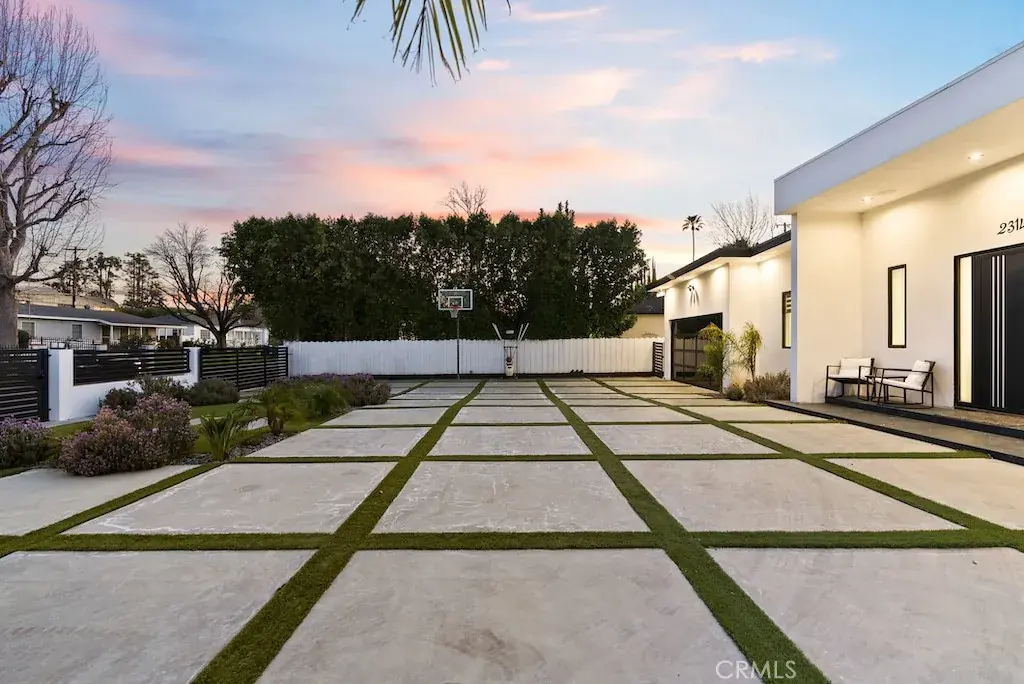 Welcome to this unique one-story modern masterpiece in the highly sought-after Walnut Acres Adjacent neighborhood of Woodland Hills. Fully rebuilt and reimagined, this expansive 3,300 sq. ft. estate offers 5 bedrooms and 4 bathrooms, including a detached guest house with 1 bedroom and 1 bathroom.From the moment you arrive, the electrical double-gated entry and circular driveway set the tone for privacy and elegance, providing parking for multiple vehicles, an RV, or even a boat. Step inside to a light-filled open floor plan with 14′ soaring ceilings, bespoke Wisconsin hardwood accent walls, custom built-ins blended with soft LED lighting, and a striking modern fireplace that together create a warm yet sophisticated atmosphere. The chef’s kitchen is designed for both beauty and function, complete with soft-close custom cabinetry, quartz countertops, a large island with breakfast bar, double sink, pot filler, high-end appliances, and plenty of workspace. The dining area, overlooking the backyard, creates the perfect setting for intimate dinners or lively gatherings. The primary suite is a serene retreat featuring vaulted ceilings, a massive walk-in closet, and a spa-inspired en-suite with dual faucets and a walk-in shower. Two spacious bedrooms share a modern Jack & Jill bath, while a junior suite offers its own walk-in closet & full bath. The detached guest house is a true bonus with its own fireplace, walk-in closet, and full bath, ideal for guests, a home office, gym, or rental income. Step outside to your private backyard paradise, a resort-style escape with a sparkling saltwater pool & spa, raised tanning deck, and covered patio with ceiling fan for year-round comfort. Host unforgettable gatherings with the outdoor kitchen, complete with double BBQ grill and built-in bar, then unwind by the sleek fire pit or dine al fresco in the covered lounge, all surrounded by lush, mature landscaping.