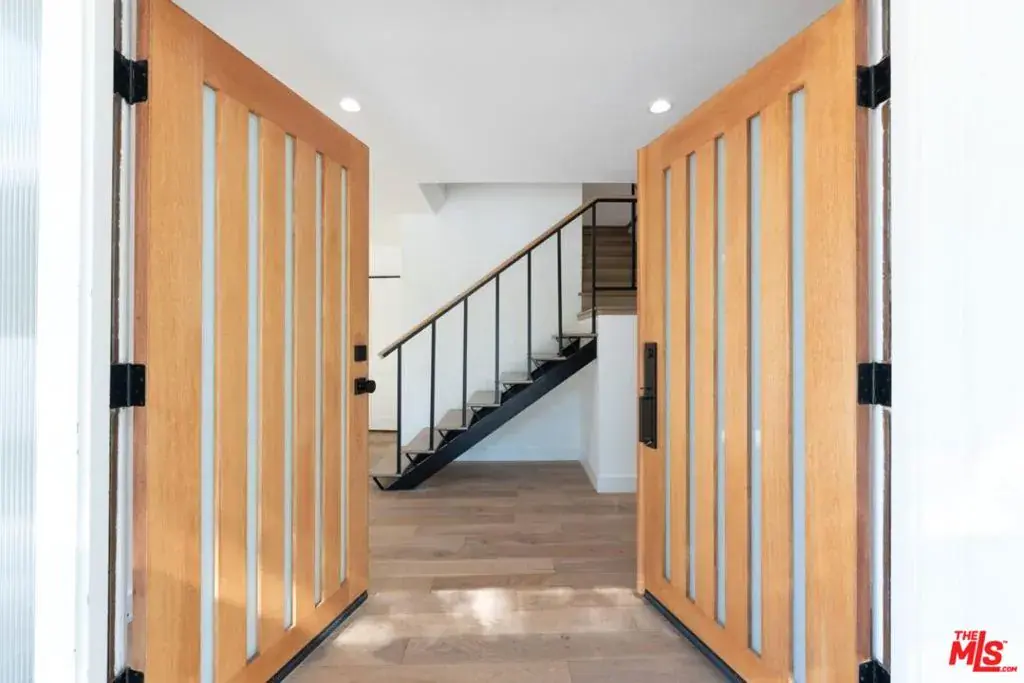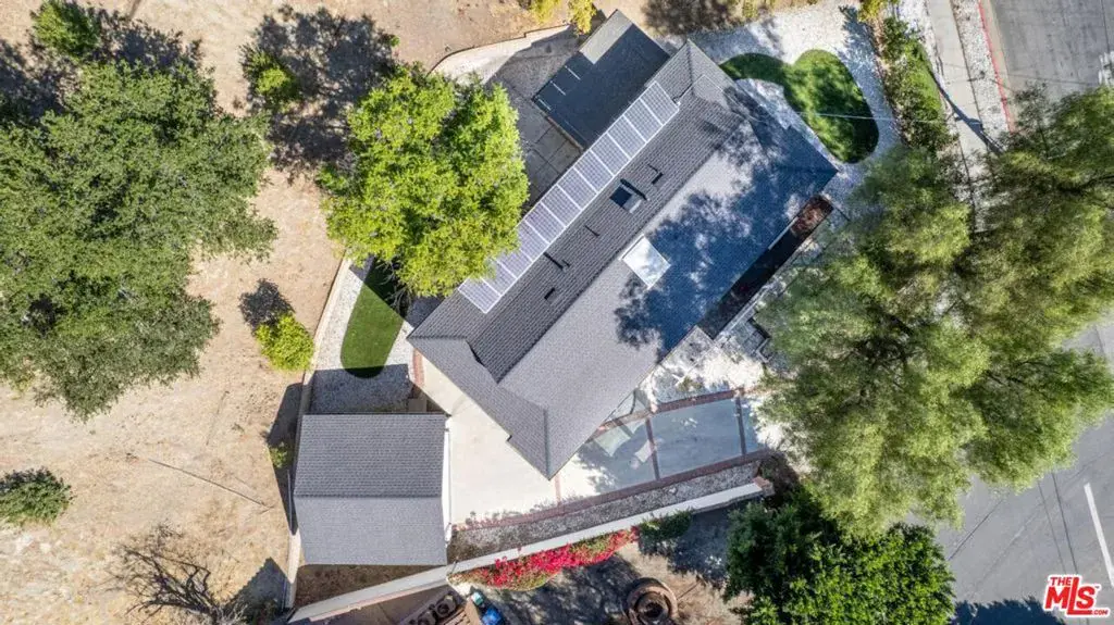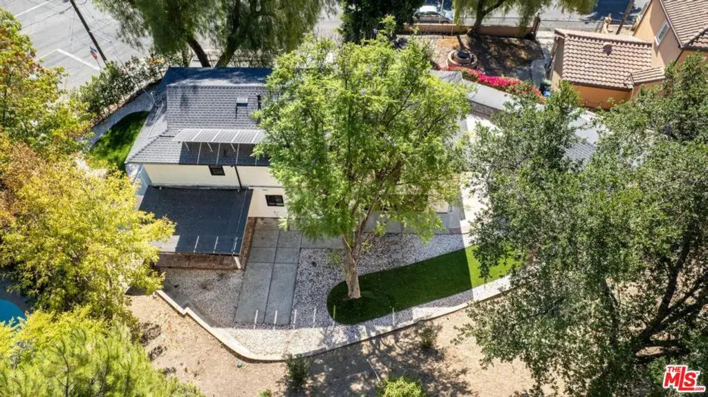 Contemporary home located in the lovely Walnut Acres neighborhood of Woodland Hills. The gated home sits on a 17,345 sq ft lot high above the street. A long private driveway accesses a detached 2-car garage. Entryway into the home is through a decorative double door that swings wide to expose an interior flooded with natural light from the large windows, sliding glass doors and skylights. A very spacious living room with access to the backyard is perfect for quiet relaxation or entertaining friends. The kitchen is completely updated and modernized with cabinets, quartz countertops and Bertazzoni stainless steel appliances. The dining area adjacent to the kitchen has sliding glass doors leading to a covered brick patio ideal for dining alfresco. The den area also features outdoor access through sliding glass doors. The 4 bedrooms are located upstairs. The primary suite is extra-large with a spacious double closet and remodeled bathroom with dual sinks. Wood floors throughout this home add to the modern appeal. Conveniently located in close proximity to the Warner Center, The Village, dining and shopping areas.
