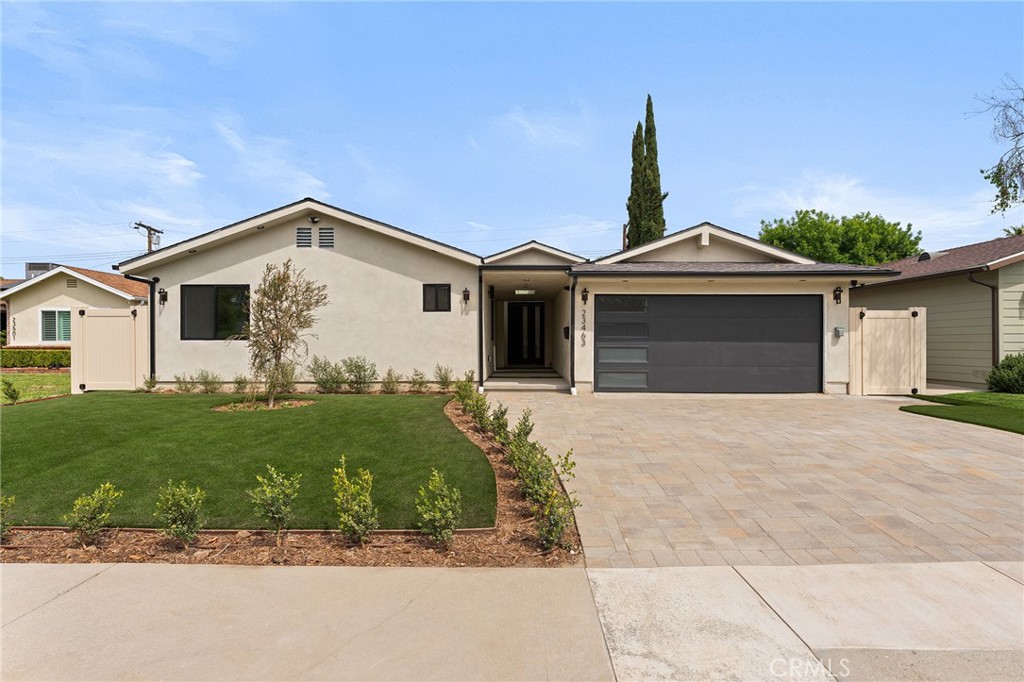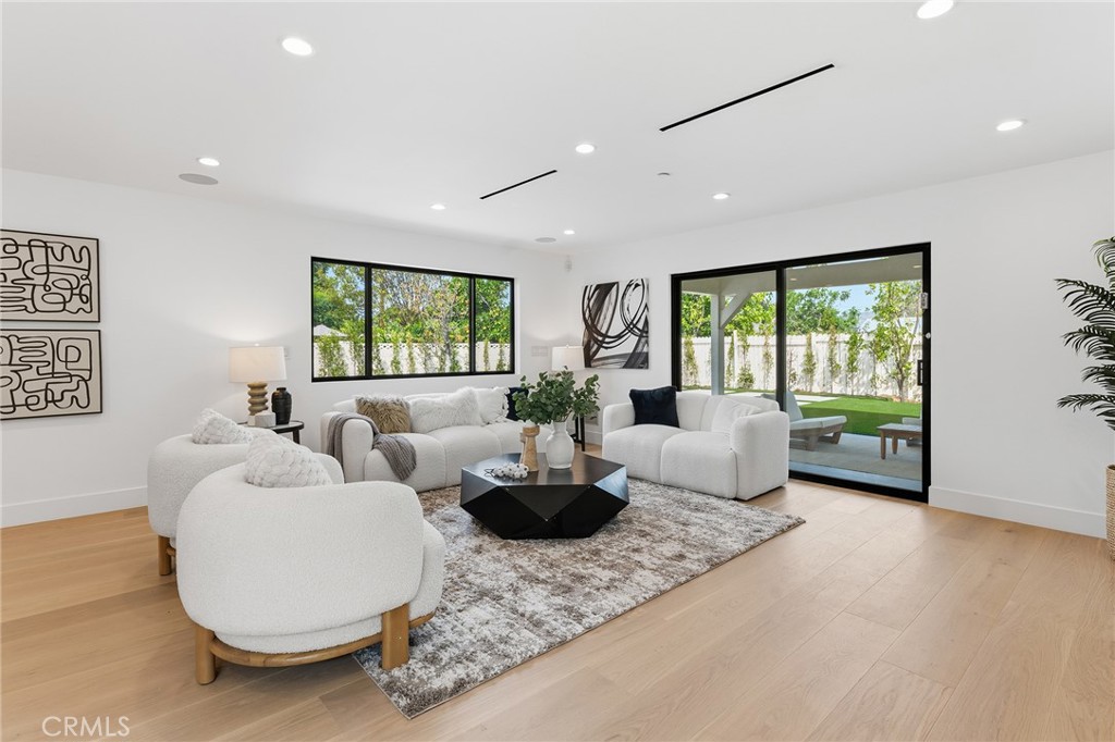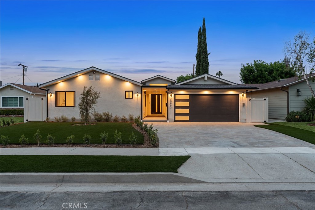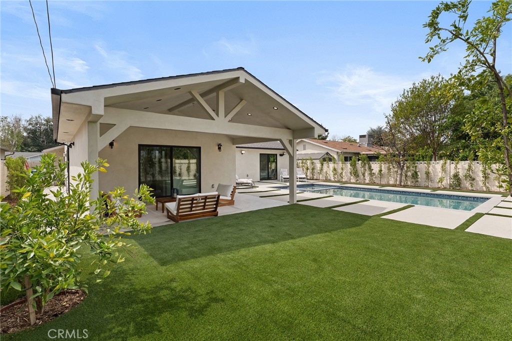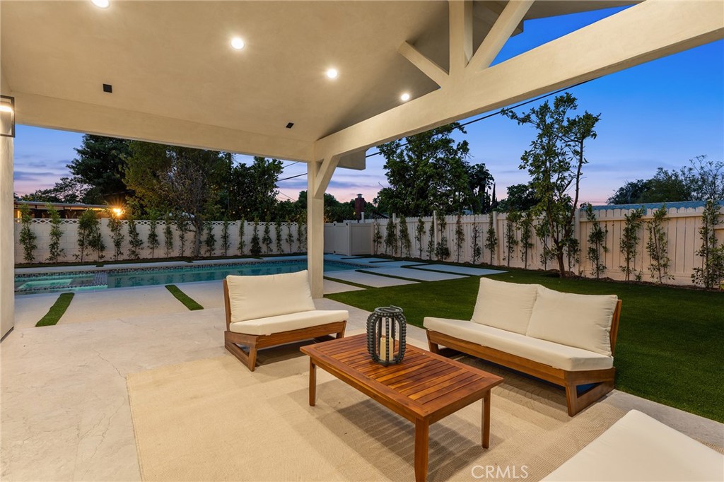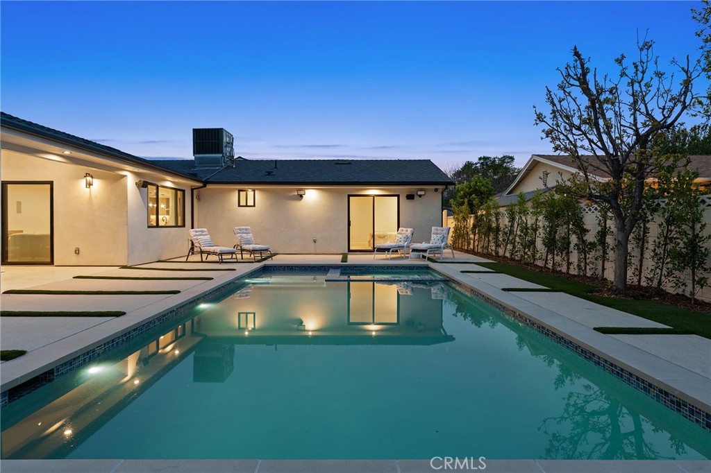 Gorgeous completely reimagined single story smart home desirably located adjacent to Walnut Acres. The expanded property truly feels like new construction as it was completely remodeled to the studs and boasts newly built pool, spa, and 220 SF covered patio. The front yard features large grass lawn, paver stone driveway that leads to the 2-car attached garage, and long covered front porch for added privacy. Step inside to find a completely open floor plan drenched in natural light featuring wide plank oak wood flooring throughout. The stunning kitchen features center island with second prep sink and breakfast bar seating, custom soft close cabinetry, Taj Mahal quartz waterfall counters, pantry space, and stainless smart appliances including double ovens and 5-burner stove with pot filler. The kitchen opens directly to both the dining area and spacious living room with built-in surround sound system and glass slider that opens to the yard. A guest powder bathroom is conveniently located off the entry near the living spaces. The primary suite is positioned perfectly to overlook the backyard and features large walk-in closet with custom built-ins and luxurious en-suite bathroom with dual sinks, designer tiling, and walk-in shower. There are three additional well appointed bedrooms, each with mirrored closets with custom organizers. One secondary bedroom has en-suite bathroom with walk-in shower. A large hall bathroom with tub and shower services the other two secondary bedrooms. There is direct access to the finished 2-car garage with epoxy flooring, recessed lighting, and built-in storage cabinets. The entertainer’s backyard is highlighted by a newly built heated pool & spa with wraparound lounge decking, 220 SF covered patio great for outdoor dining, synthetic lawn for play, and newly planted ficus plants + several fruit trees. Additional upgrades per seller: all new HVAC/linear venting, new 200 AMP electrical panel, new roof, new tankless water heater, all new plumbing, new Milgard windows, new exterior drainage, fire sprinklers, and smart home tech including camera system, alarm system, built-in Wi-Fi extenders, and Ring. Adjacent to Westfield Mall/Village, Calabasas Commons, Warner Center with the new Rams Village in development, local parks/hiking trails, & zoned for award-winning El Camino & Hale charter schools.