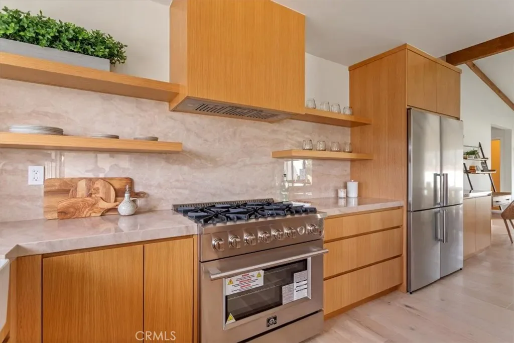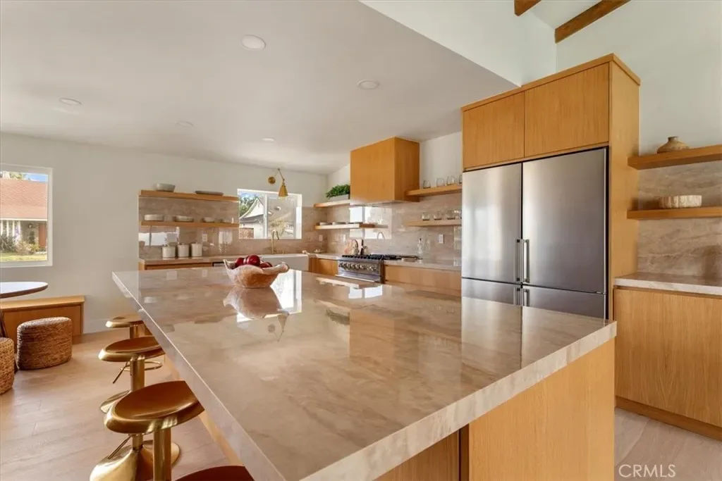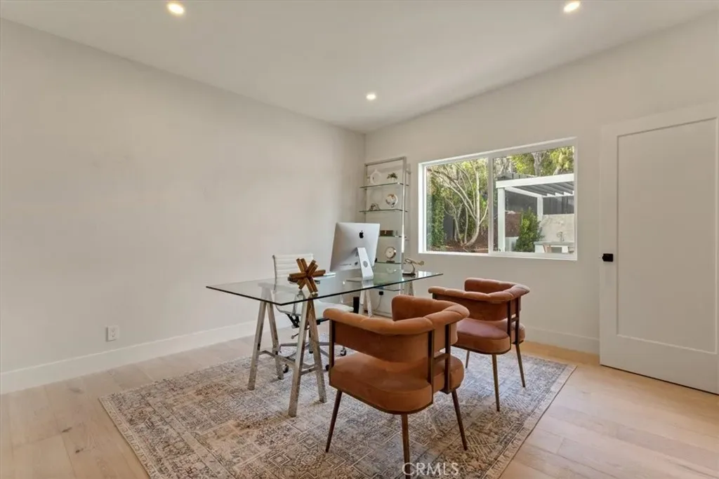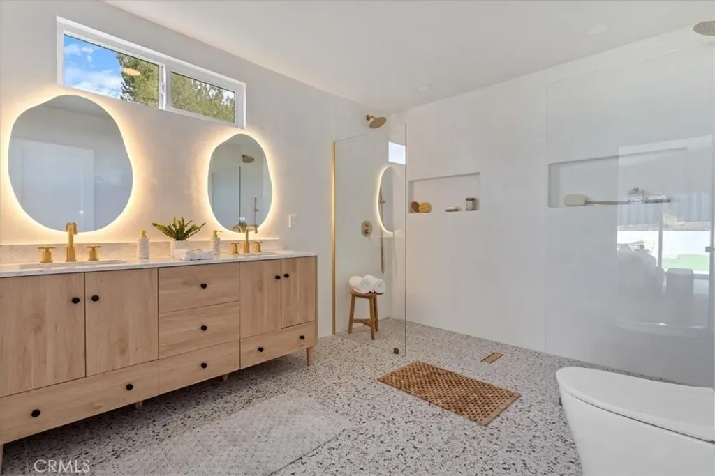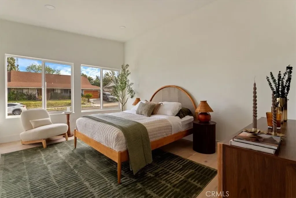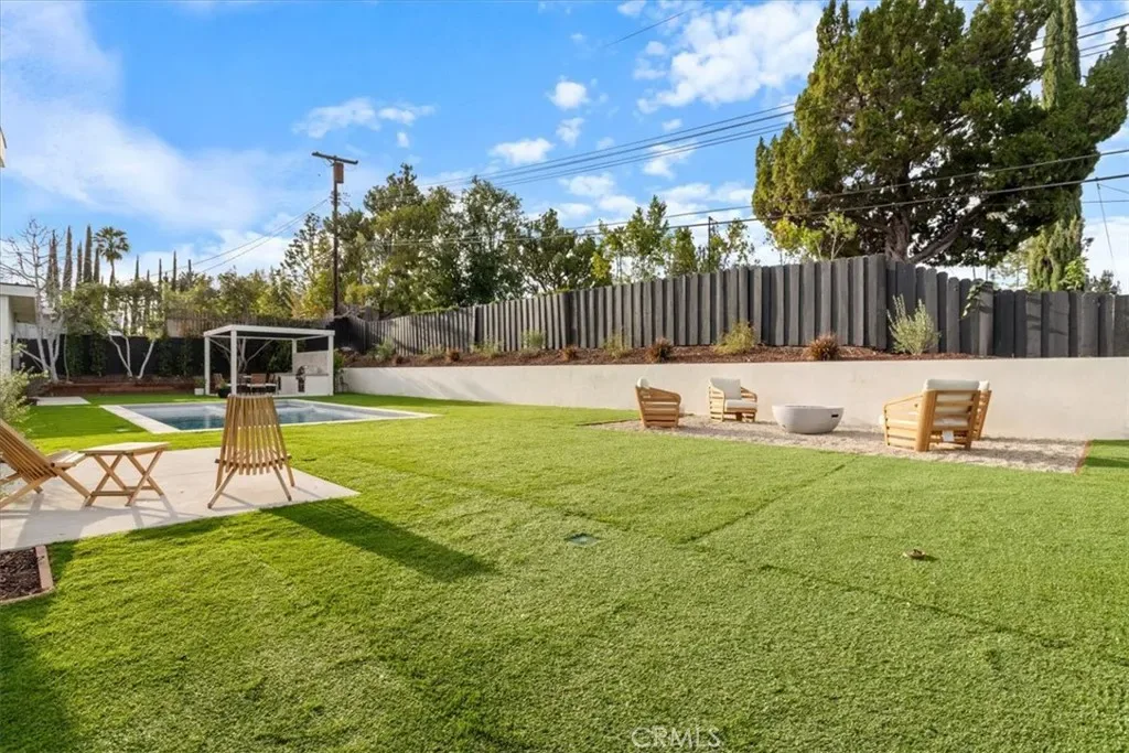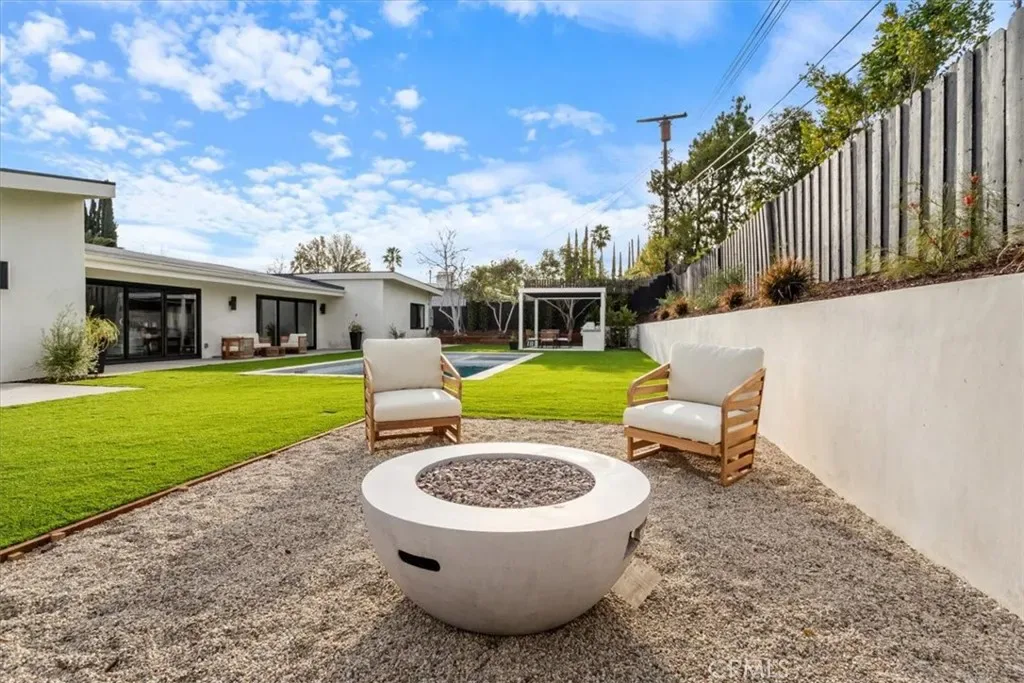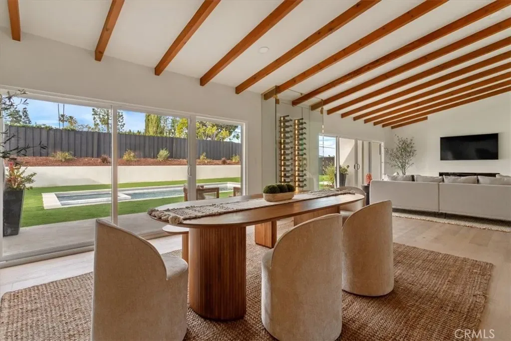 Completely Reimagined iconic Charles Du Bois mid-century home, timeless architectural Design with modern volume, warmth, and functionality This 4-bedroom, 3 bath boasting 3,160 sqft residence honors the original spirit of Du Bois design while elevating it for contemporary living. The homes layout has been redesigned to introduce an Open floor plan living room / Dining room with high Beamed ceilings, creating an expansive sense of scale and light rarely found in homes of this era. true indoor-outdoor living allowing the interior spaces to flow effortlessly into the landscape. Throughout the home, custom oak cabinetry has been meticulously designed and built in every space, offering warmth, cohesion, and exceptional storage without compromising clean architectural lines. The dining room flows seamlessly with the Living room and kitchen making it ideal for entertaining. The kitchen is both sculptural and functional, featuring Forno appliances, natural Taj Mahal Golden Porcelain countertops, and a kitchen nook with benched seating that serves as the heart of the home. The residence offers dual primary suites, thoughtfully positioned on opposite sides of the home to provide privacy and flexibility perfect for guests, in-laws, or work-from-home needs. Outside, the property continues to impress with a modern linear pool and spa, a covered outdoor BBQ Entertainment area, and multiple zones designed for relaxation and entertaining. A pebbled fire pit area with plenty of seating area the sets the tone for gatherings both intimate and lively. Every system in the home has been updated this is a fully rebuilt residence, offering the confidence of new construction with the soul of a mid-century classic. A rare opportunity to own a true architectural masterpiece rooted in history, redefined for modern life, and perfectly suited for the Woodland Hills lifestyle.