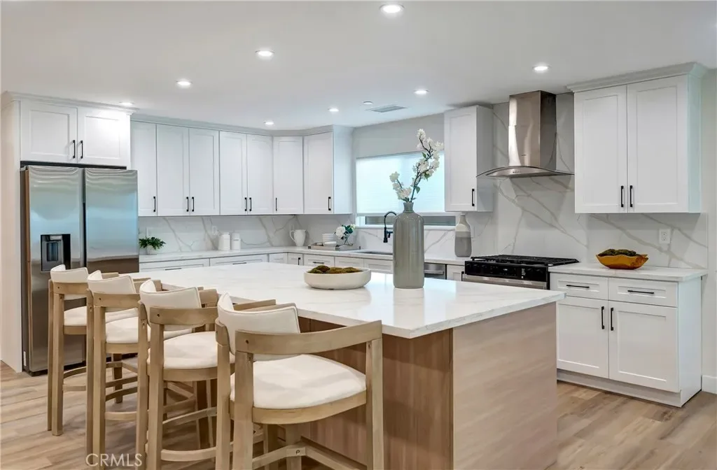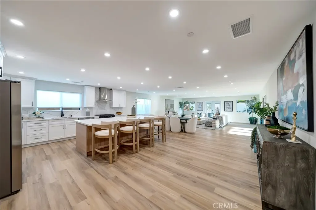 Open floor plan connecting the living, dining, and kitchen areas, ideal for modern living and entertaining. The kitchen features a large quartz island, custom cabinetry, stainless steel appliances, gas range, and contemporary finishes.