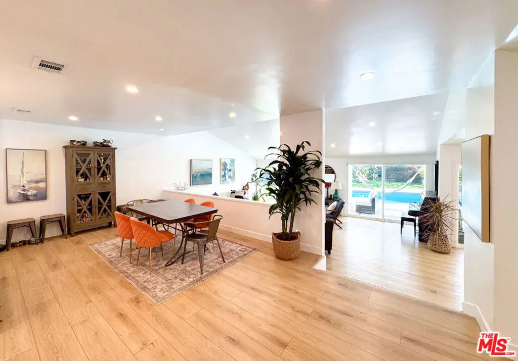 Brimming with character and nestled in the beloved “artist streets” of Woodland Hills – Picasso, Gauguin, Matisse, Da Vinci, and Cezanne – this beautifully remodeled 5-bedroom, 3-bath + pool home sits at the scenic junction where Topanga Canyon, Calabasas, and Woodland Hills converge. Thoughtfully designed for comfort, connection, and California living, the spacious layout features sun-drenched interiors and a seamless indoor-outdoor flow. A modern minimalist kitchen anchors the heart of the home, complete with a large breakfast island with built-in charging station, sleek hooded range, and stylish lighting. The adjacent dining area leads to both formal and informal sunken living rooms, where newly added French doors open to the landscaped backyard. A corner bar in the family room invites relaxed evenings whether you’re gathering for sunset cocktails or cozying up by the upgraded fireplace (now both wood and gas). With five versatile rooms, the home includes a private guest suite with direct access to a side courtyard and a dedicated office ideal for remote work or creative pursuits. Upstairs, the expansive primary suite offers peaceful pastoral views, a spa-like bath with double-sink vanity, oversized shower, and ample closet space. Two additional spacious bedrooms and two additional full bathrooms round out the interior. Outdoors, the newly landscaped grounds feature lush turf, an extended side yard for play, a heated pool with new filtration system, covered patio, and multiple private nooks perfect for dining, lounging, or unwinding under the stars all set within a privacy-fenced perimeter. Located moments from scenic hiking and biking trails, award-winning schools, and premier shopping, this is more than a house – it’s a home base for inspired family living.