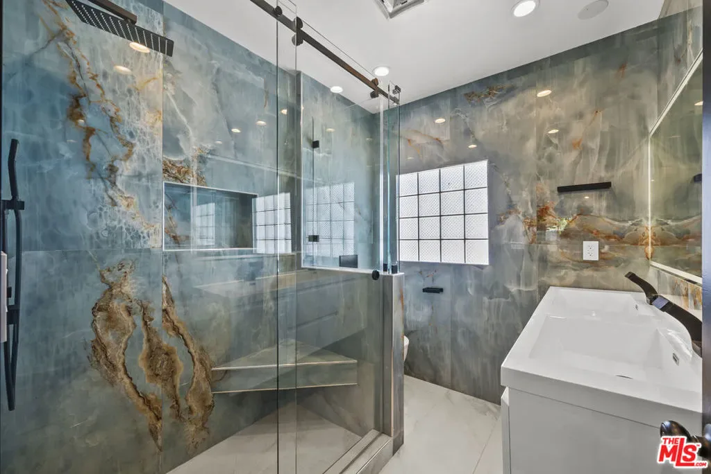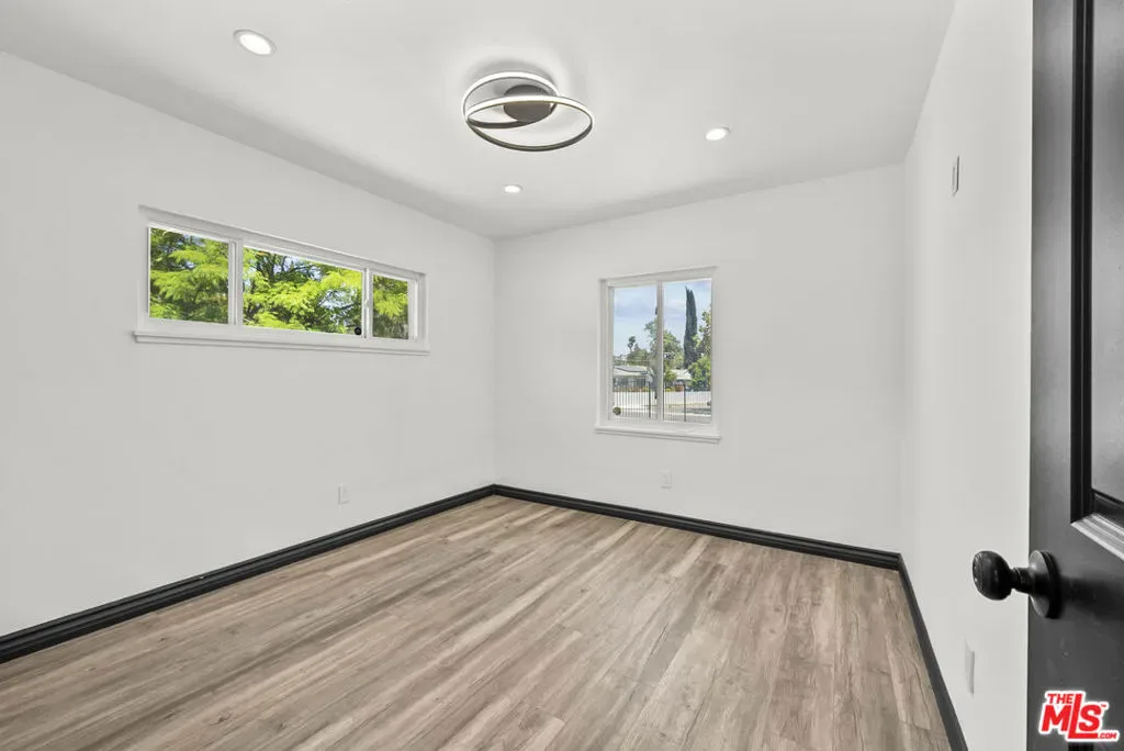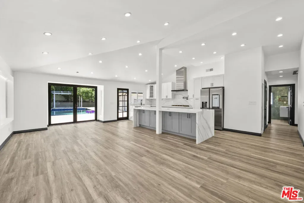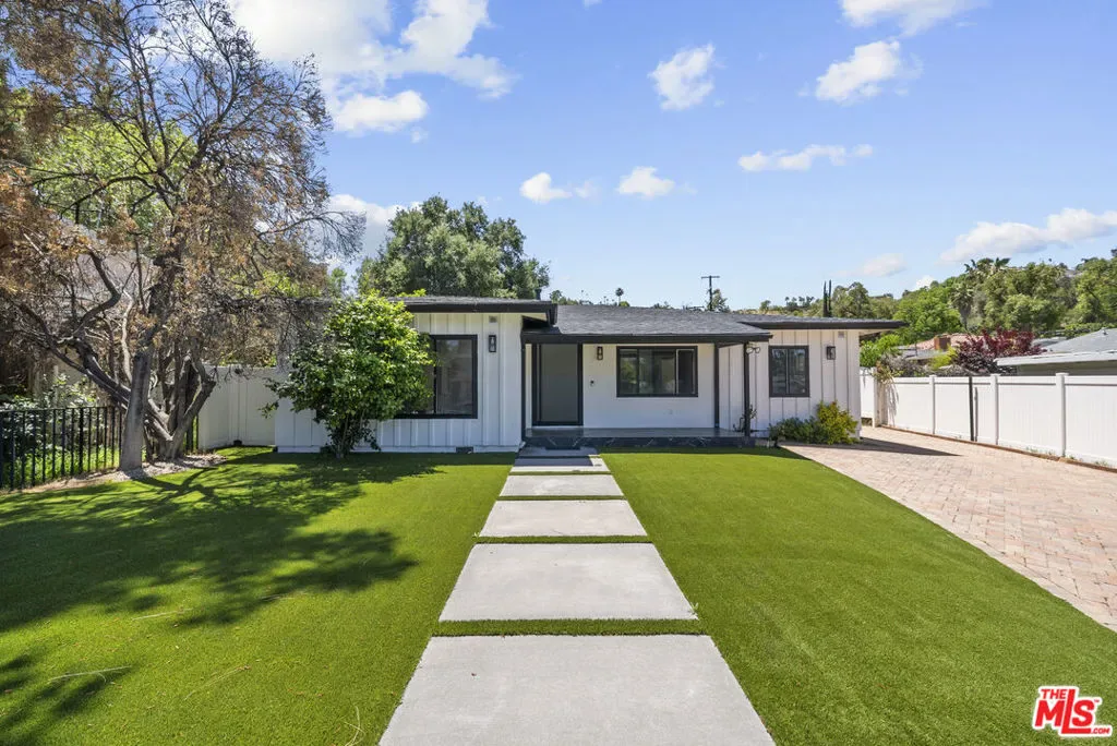 Located south of the boulevard in Woodland Hills, this remodeled home offers 3 bedrooms and 2.5 bathrooms with a functional open floor plan. The interior features wide-plank flooring, recessed lighting, and a modern kitchen equipped with quartz countertops, custom cabinetry, a center island, and stainless steel appliances. The backyard features a private pool, patio, and landscaped surroundings that provide a dedicated outdoor space. The layout includes a primary suite, two additional bedrooms, and updated bathrooms with contemporary finishes. The property is situated minutes from Ventura Boulevard, with access to nearby shopping, dining, and local amenities.