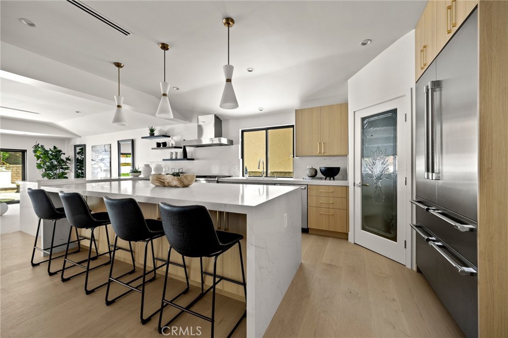 Featuring 4 spacious bedrooms and 3 beautifully appointed bathrooms, the home has been meticulously designed for seamless indoor-outdoor living. At the heart of the home is a chef’s dream kitchen, equipped with top-of-the-line Thermador appliances, including a built-in refrigerator, a stunning 10+ foot island with abundant seating, plus an additional peninsula island with even more seating options—perfect for both everyday living and entertaining.The adjacent family room opens to the private backyard through expansive multi-slide doors, creating a true indoor-outdoor flow. Outside, enjoy a built-in outdoor kitchen complete with BBQ and sink, ideal for al fresco dining and gatherings.The luxurious primary suite also features direct access to the backyard, an oversized walk-in closet, and a spa-like bathroom with dual vanities, a makeup station, and high-end finishes throughout.
