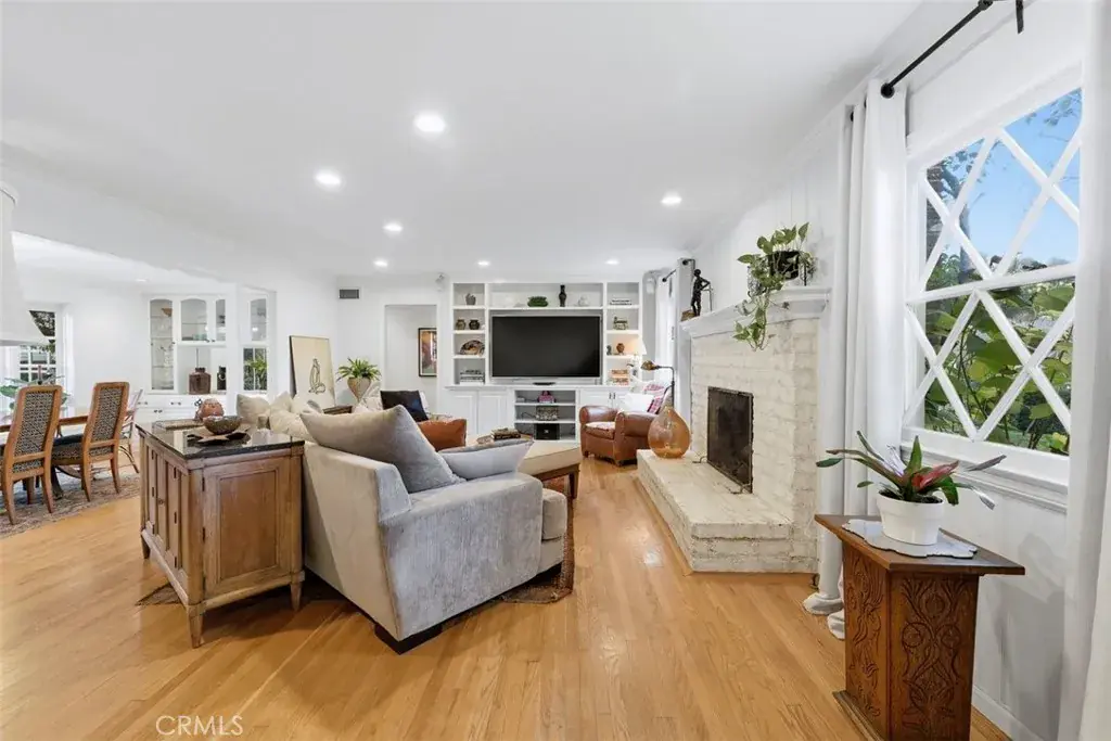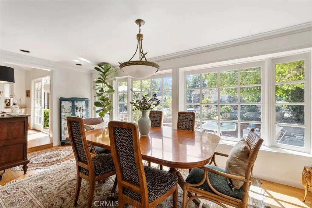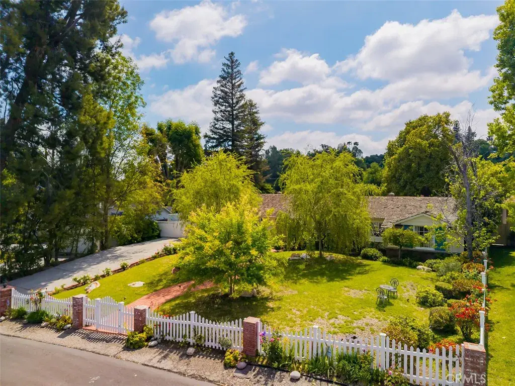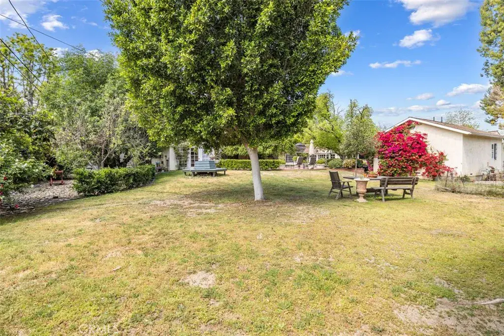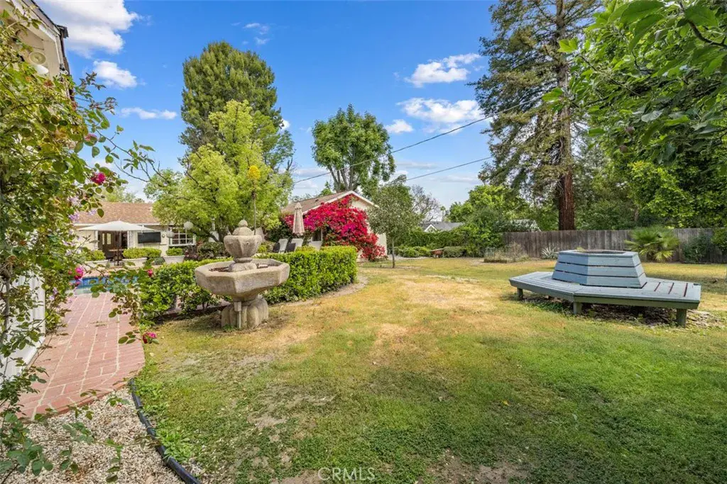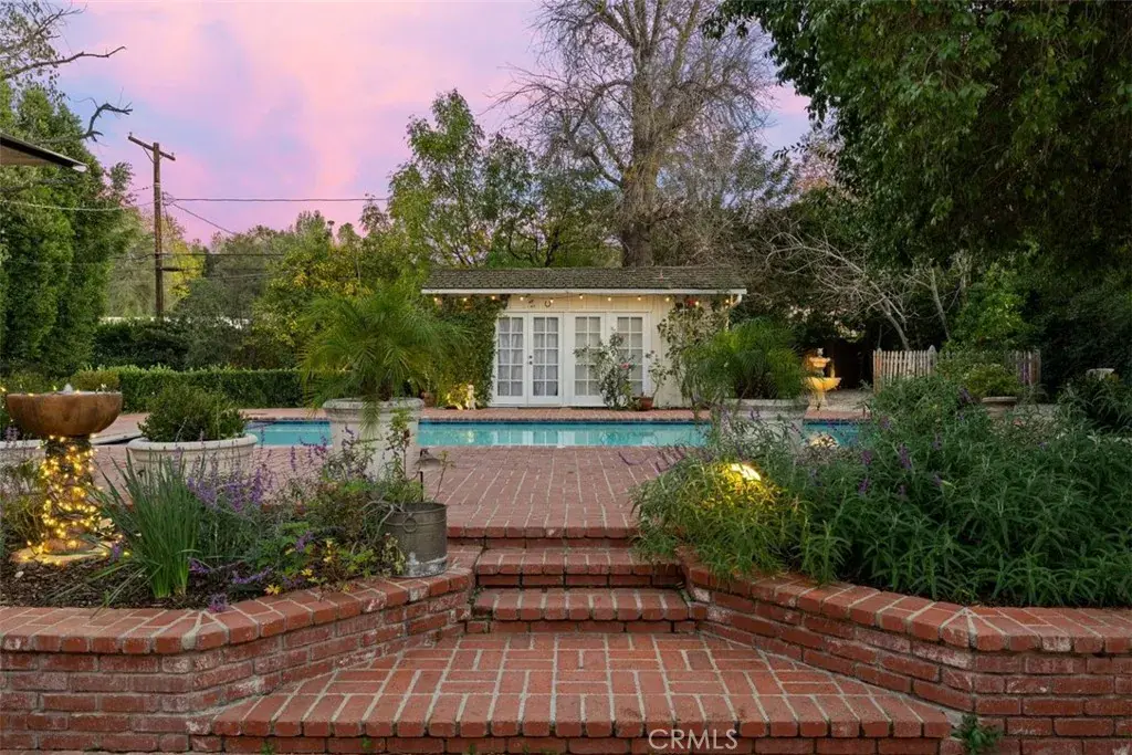 5132 Quakertown Avenue is a single-story ranch set on over 19,000= square feet of flat, private land the kind of lot that is increasingly rare in the western San Fernando Valley. A curving brick walkway leads past weeping willows to a distinctive jewel-toned Dutch door with original leaded glass. Inside, the home flows naturally from room to room through French doors and divided-light windows, connecting interior living spaces to the gardens and yard at nearly every turn. The kitchen is the heart of the home vaulted beamed ceilings, a substantial brick fireplace, a casual bar nook, and direct access to the outdoor brick BBQ area and pool patio. The formal living room features a second fireplace, diamond-pane windows, and built-in shelving. A generous dining room wrapped in windows completes the main living areas. The primary suite is privately situated at the rear of the home with vaulted ceilings and an en suite bath. Three additional bedrooms are thoughtfully arranged on opposite wings of the home, served by two full bathrooms a layout that offers natural separation and privacy for family members or guests. The detached pool house with French doors and its own fountain courtyard offers flexible space for guests, extended family, or a home office. An outdoor shower just outside adds to the resort feel. The expansive flat lot provides ample room to expand the existing pool house or add additional structures flexibility that simply doesn’t exist on the smaller lots typical of newer developments. Hardwood floors run throughout. Three apple trees, a fig, and an apricot grow on the grounds. The newly plastered pool and a new roof offer peace of mind from day one. A spacious side driveway on the left provides room for an RV or extra vehicles, while a dedicated dog run along the right side adds a practical touch for pet owners. Mature trees and the expansive flat lot create a backyard that feels private, peaceful, and enduring a rare combination of land, character, and setting in one of Woodland Hills’ most desirable pockets.