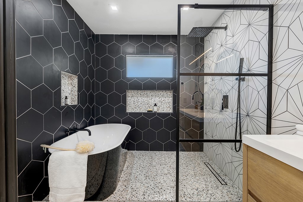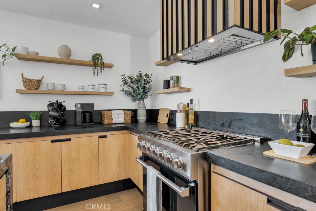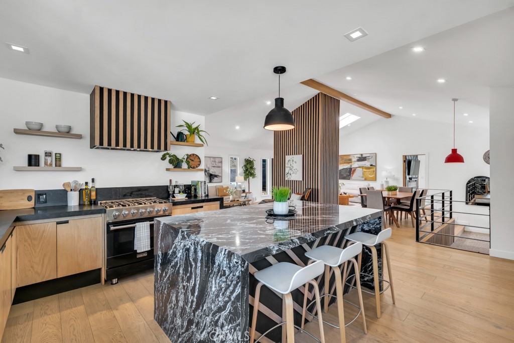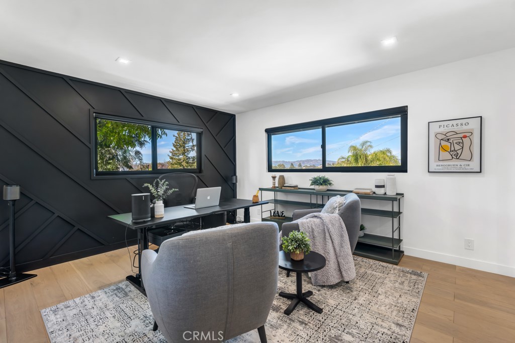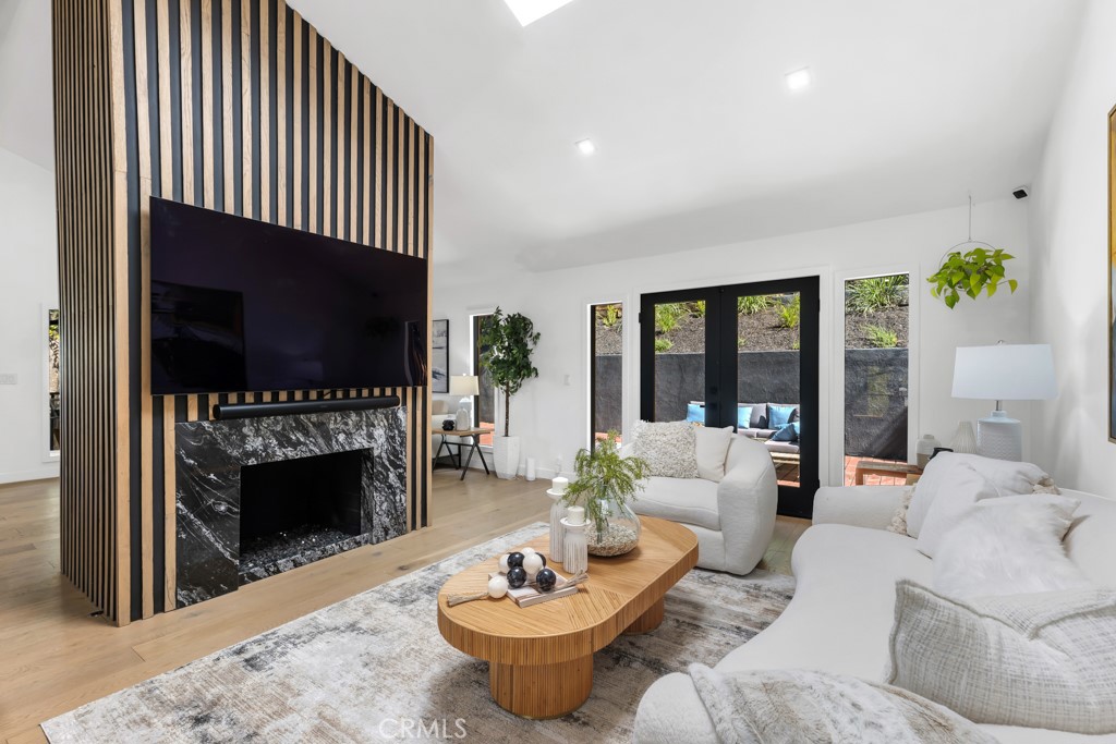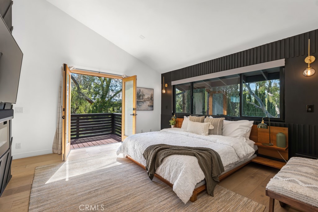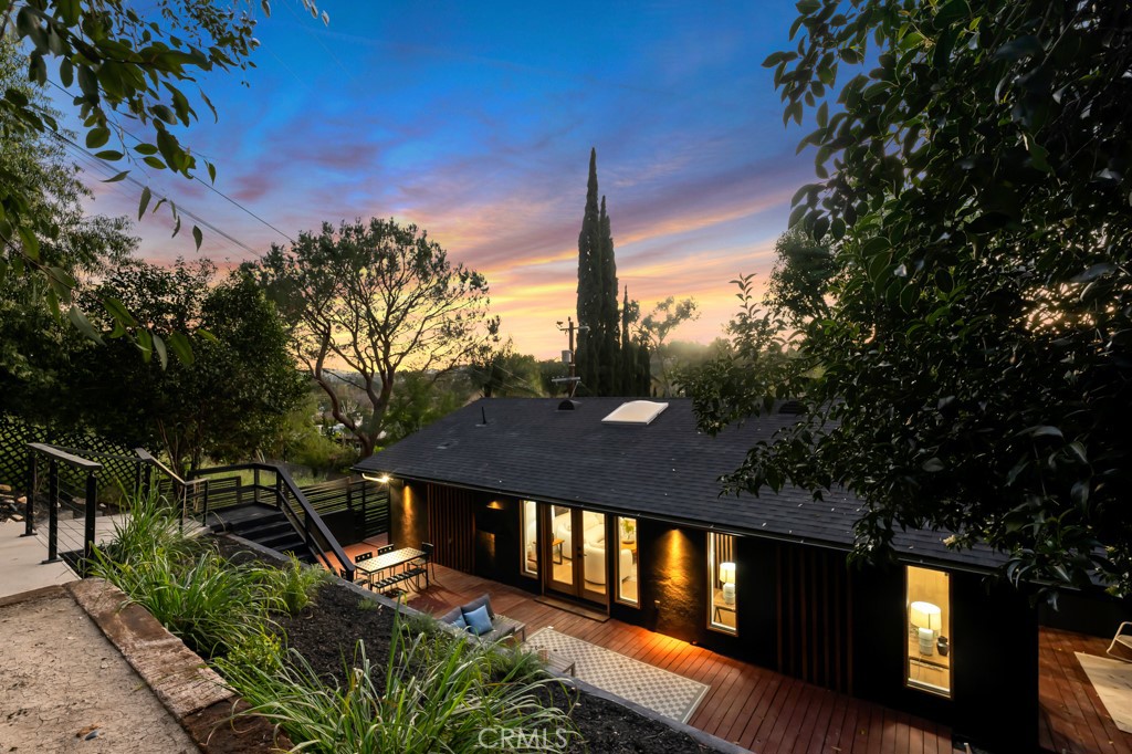Ideally tucked away at the end of a private flag lot, this reimagined and ultra sleek Mid-Century Modern masterpiece is a true architectural statement. An industrial iron-and-glass double-door entry reveals a light-drenched, open-concept interior defined by soaring double-height vaulted ceilings and exquisite wide-plank flooring throughout. The chef’s kitchen has epic panoramic views and serves as the home’s centerpiece, anchored by a massive single island with imported Brazilian quartzite countertops, professional-grade Viking appliances, and a spacious walk-in pantry. Framed by expansive windows and multiple sets of French doors, the living space offers a seamless indoor-outdoor flow to wrap-around decks and a flat lounging pad. The backyard is a private sanctuary, featuring a romantic covered sitting area perfectly that is perfectly positioned to capture breathtaking daily sunsets. Set on a rare 13,969-square-foot lot that, the property offers unparalleled privacy, exclusivity, and space. Complete with a luxurious oversized primary suite with a gorgeously updated ensuite bathroom, and its own private viewing balcony. Located just walking distance from Ventura Boulevard with all of the community’s vast amenities, this home is ideal for elite and luxurious living.