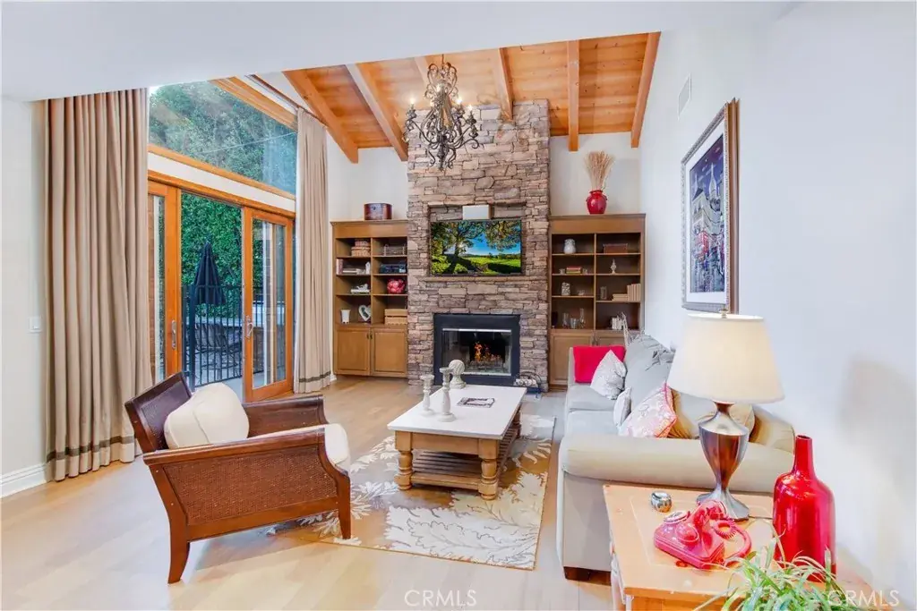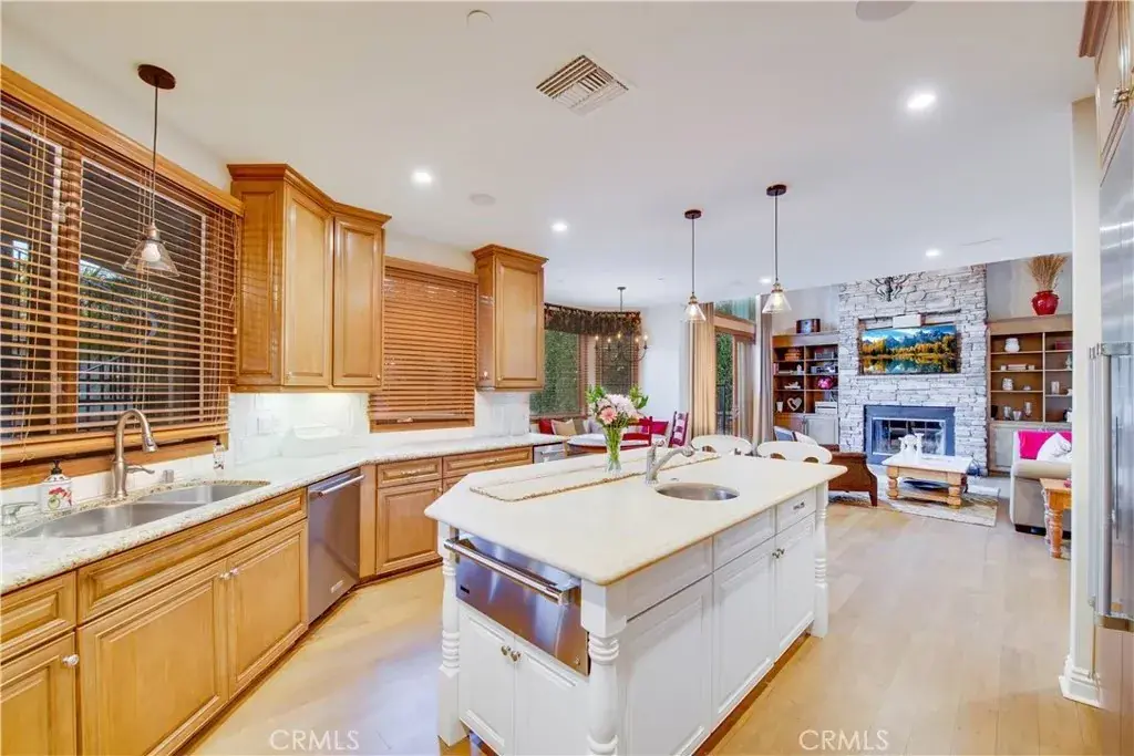 An inviting slate tile entry leads to a formal living room with fireplace and brand-new carpeting, opening to a charming patio with an outdoor fireplace. The chef’s kitchen is a true showpiece, boasting granite and limestone countertops, a Thermador gas range, newer built-in Thermador refrigerator/freezer, KitchenAid warming oven and dishwasher, large island with prep sink, breakfast bar, built-in banquette, butler’s pantry, and desk area. The adjacent family room impresses with soaring two-story wood-beamed ceilings, a dramatic stone fireplace, direct access to the pool area. The formal dining room includes a wine refrigerator and space for large gatherings.