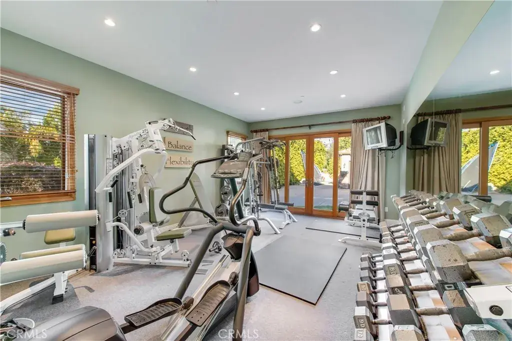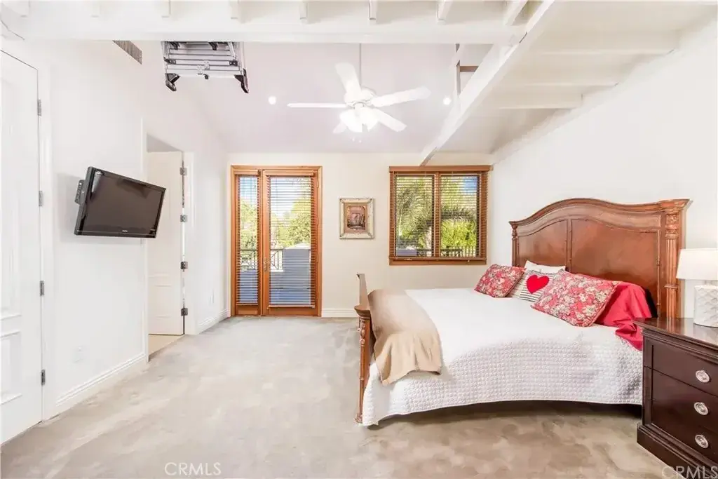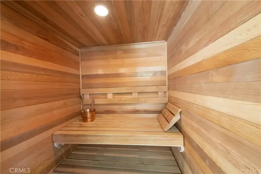 Newly sanded and stained wood floors enhance the home’s refined design. The first level includes a bedroom with ensuite bath, gym, laundry room, mudroom, and powder bath. Upstairs, the expansive primary suite features vaulted wood ceilings, dual walk-in closets, and a private balcony with a spiral staircase leading to the backyard. The luxurious primary bath offers a spa tub, fireplace, separate shower, dual sinks, and sauna. Three additional bedrooms upstairs include walk-in closets—one with a loft—and ensuite or Jack-and-Jill baths with dual sinks and a spa tub. A cozy sitting area opens to a front balcony, and a second laundry room.
