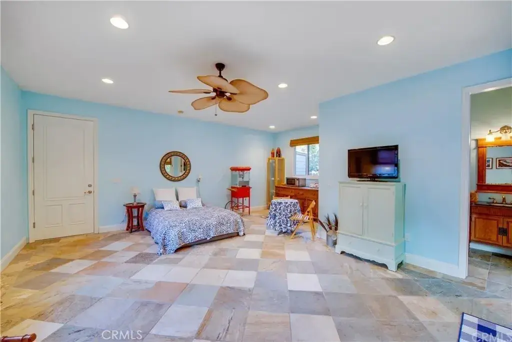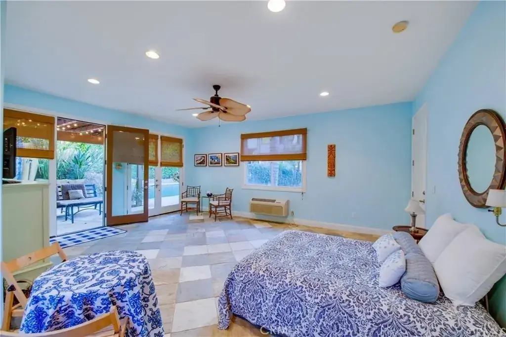 The detached 552-square-foot guest house includes slate tile flooring, a full bath, wall AC/heat unit, and plumbing for a kitchen, with direct access to the pool area.