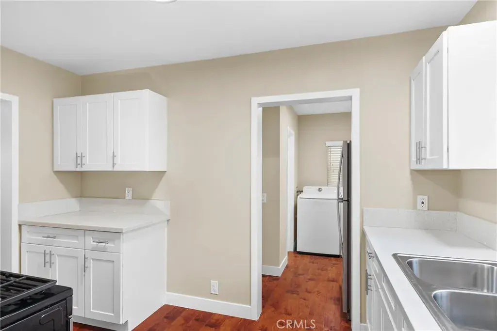 The home features a bright, open floor plan with hardwood floors, fresh interior paint, and abundant natural light. The spacious living area flows into the kitchen with stainless-steel appliances, cabinetry, and convenient in-unit laundry.