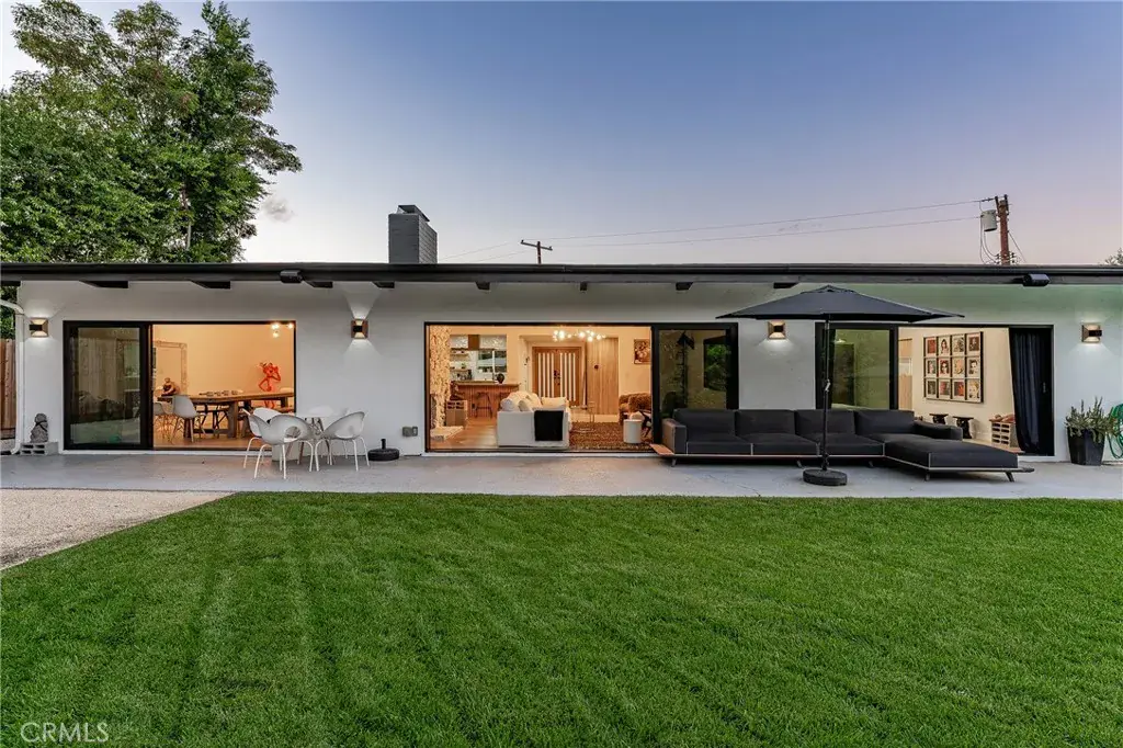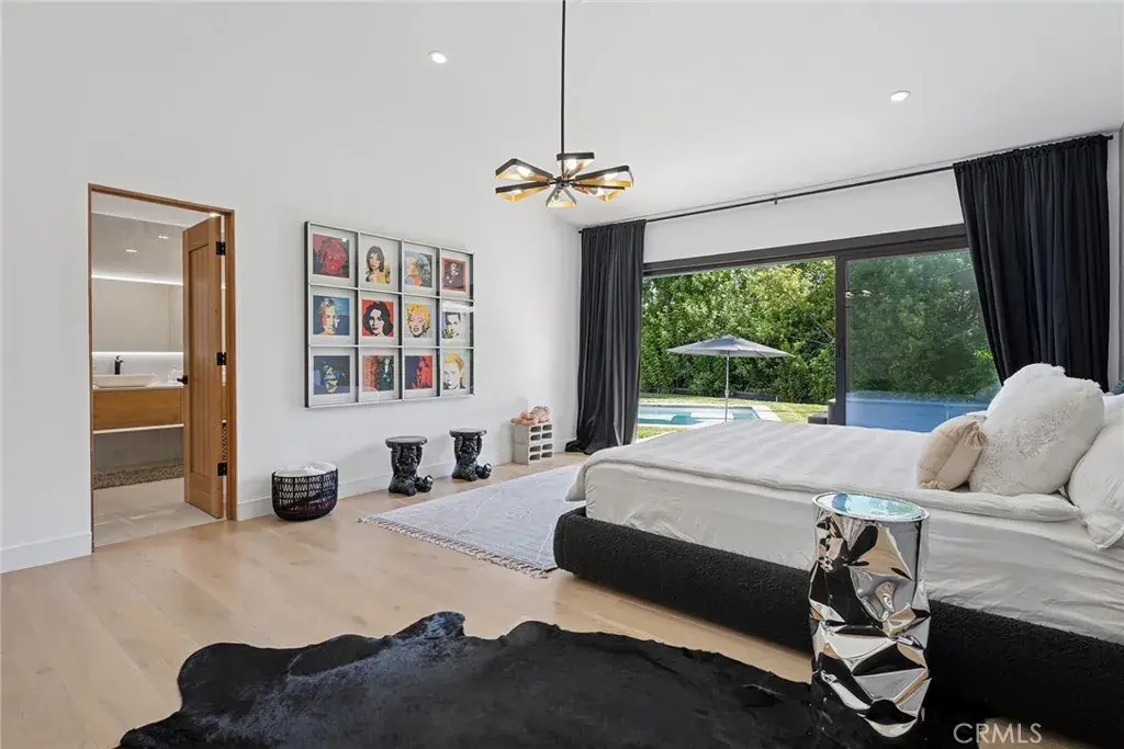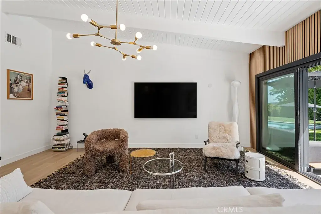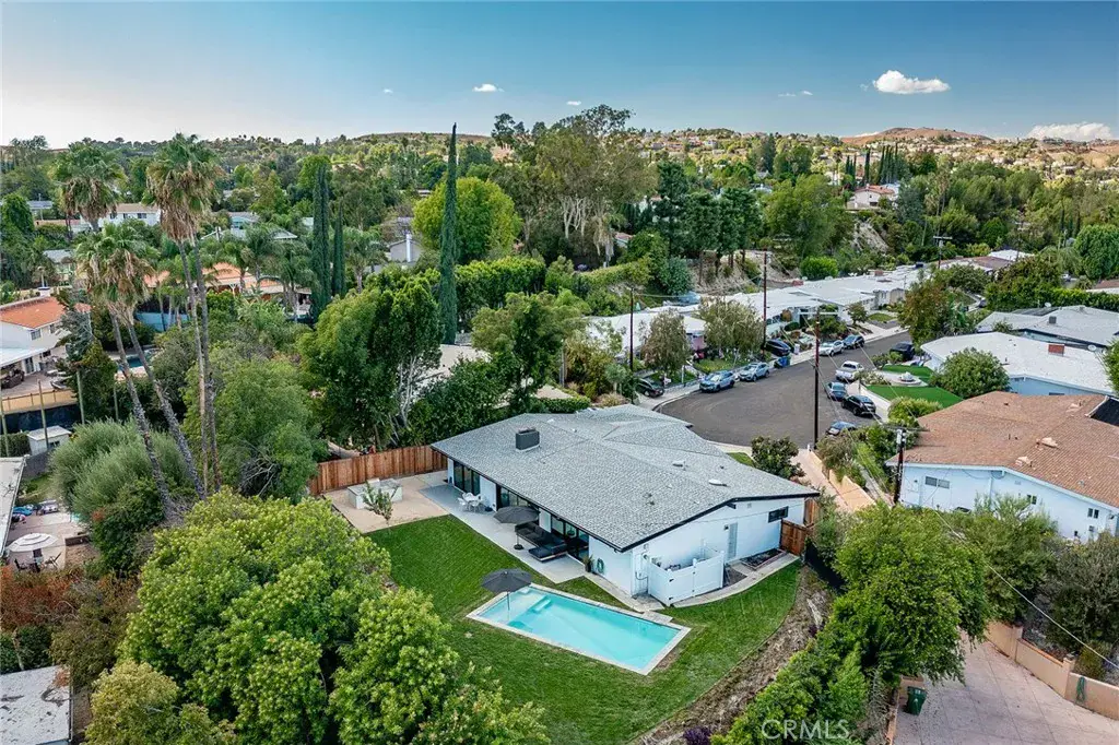 Gorgeous single story Mid-Century modern Charles Du Bois with newly built swimming pool and dazzling Valley, mountain, & city light Views! The property is situated at the very end of a quiet cul-de-sac West of Valley Circle on an expansive private lot. The home sits back from the street with large grass lawn & covered front porch adorned with natural stone & wood siding. Step through double doors into the entry foyer with custom wood accent wall, coat closet, & wide plank oak wood flooring found throughout. The entry opens directly to the oversized living & dining rooms each featuring vaulted wood beamed ceilings, double sided stone fireplaces, wood accent walls, & large glass sliders that open to the backyard for the perfect indoor/outdoor flow. The dining room additionally has a built-in bar with wine fridge & storage. The stunning chef’s kitchen opens to all living spaces and boasts center island with Brazilian quartzite countertop, custom soft close white oak cabinetry, dimensional tiled backsplash, stainless appliances including a 48” range with double ovens & 6-burner stove + griddle, Fisher & Paykel fridge/freezer, and separate breakfast nook with glass slider that opens to a side patio perfect for sipping your morning coffee. The luxurious primary bedroom features high vaulted ceiling, venetian plaster accent wall, large glass slider that opens directly to the pool, spacious walk-in closet with built-ins, & en-suite spa bathroom with floating vanity, dual sinks, walk-in shower, soaking tub, & smart bidet toilet. Two secondary bedrooms are each well appointed with custom closets. Each room has access to a private bathroom with walk-in shower, something seldom seen with Du Bois layouts. One of the bathrooms is located at the end of the hallway with exterior access great to use for both a guest powder bath & pool bath. The backyard is truly an entertainer’s retreat highlighted by a 2023 newly built heated pool with Baja lounging deck & cascading fountains, sprawling grass lawn, BBQ center with fridge & bar top seating, plus sweeping patio perfect for outdoor dining. Additional features include finished 2-car garage with direct access & epoxy flooring, smart home technology including built-in audio, smart lighting, & security system with cameras. Adjacent to dining/shopping at the Westfield Mall/Village, Calabasas Commons, local parks/hiking trails, & zoned for award-winning El Camino & Hale charter schools.