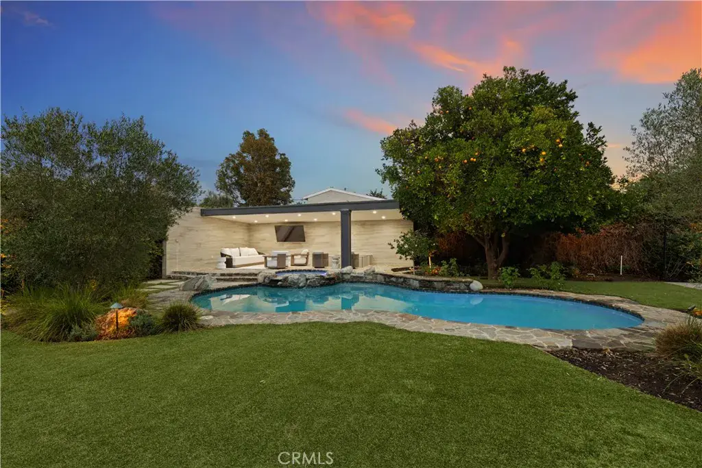 Welcome to this beautifully updated home, set on a sprawling .42 acre dual-gated lot in the highly sought-after Walnut Acres neighborhood of Woodland Hills. An expansive, landscaped front yard and generous setback provide exceptional privacy and a grand approach to the home, enhanced by towering mature hedges and privacy landscaping surrounding the property that create a private, estate-like setting. Double doors open to a grand foyer with soaring double-height ceilings that flow seamlessly into a spacious family room. Anchored by a stunning fireplace, the family room opens to a designer chef’s kitchen featuring top-of-the-line appliances, a massive island with seating and sun-drenched breakfast nook. The main living area also offers an inviting formal living and dining room, perfect for hosting holiday gatherings or intimate dinner parties. French doors open to a private backyard retreat designed for effortless entertaining. Surrounded by lush, mature landscaping, the outdoor space boasts a sparkling pool/spa, poolside cabana with a built-in firepit and outdoor TV, a sports court and outdoor BBQ with bar seating. Spread throughout the home are five generously sized bedrooms along with five full bathrooms, including an expansive primary suite highlighted by a private balcony that overlooks the backyard, dual walk-in closets and a spa-inspired bathroom, complete with a soaking tub, oversized walk-in shower and double vanity. Additional amenities include a large attic for extra storage, three-car garage and private dual-gated circular driveway. This property is conveniently located nearby Westfield Topanga Mall, Topanga Village, Warner Center, Ventura Boulevard and so much more. Lease includes pool and landscaping services, and is available partially or fully furnished.