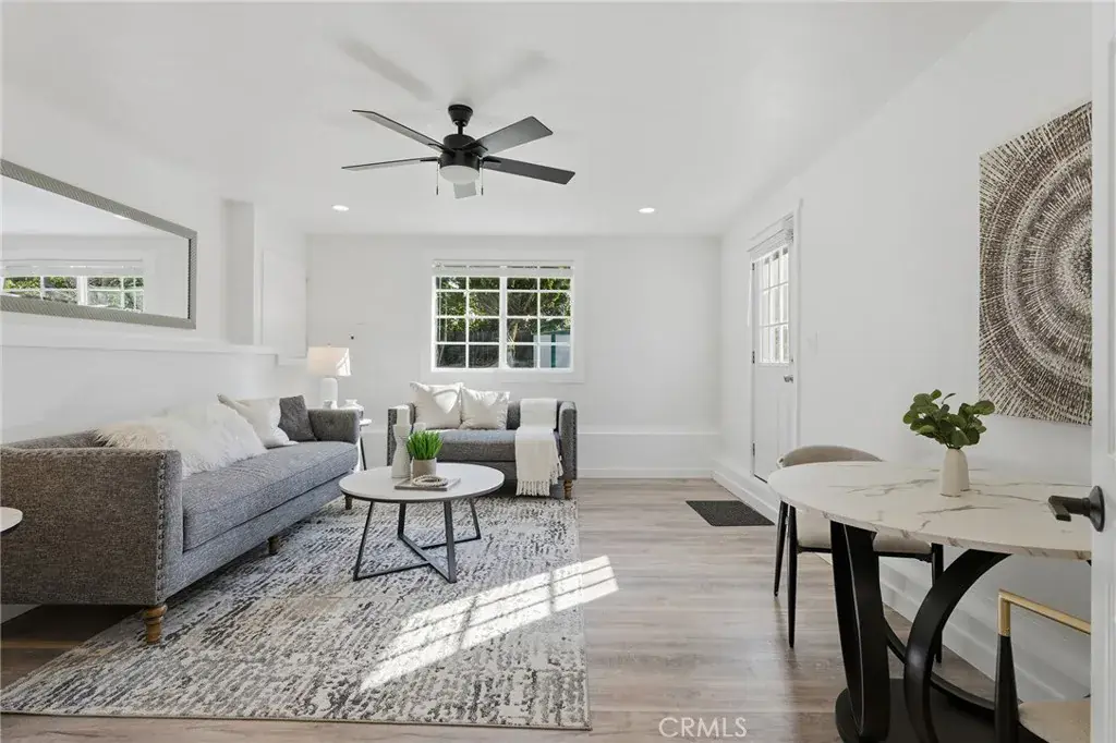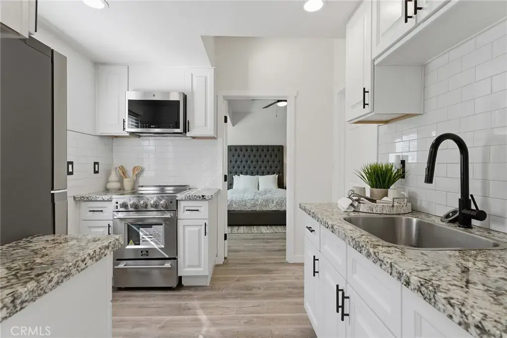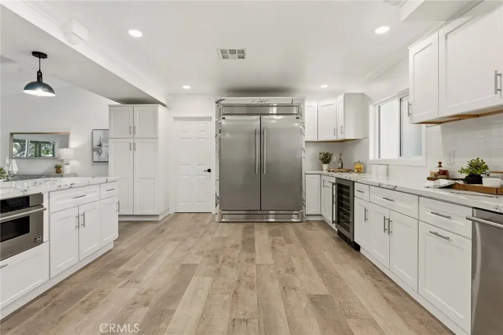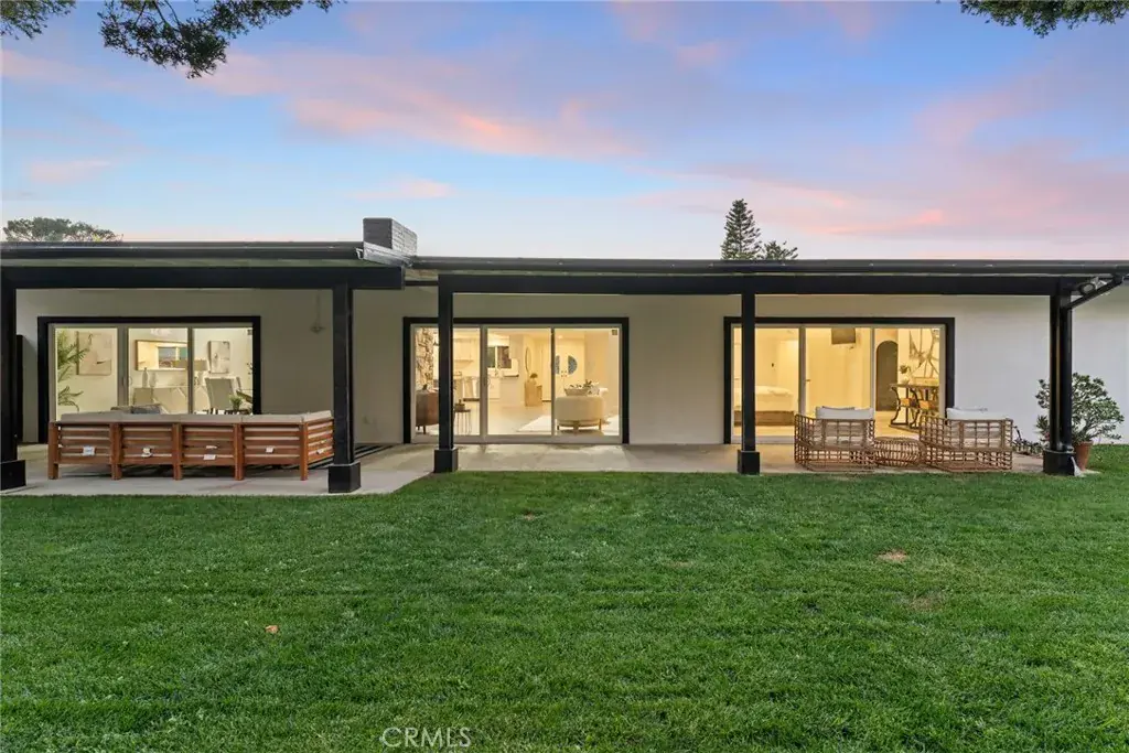 Meticulous and highly upgraded mid-century modern Charles Du Bois single level home with attached guest apartment with separate kitchen! The property sits elevated above the street on a sprawling 11k lot boasting almost 100 feet of frontage adorned with manicured front lawns and lush landscaping. An ascending stone pathway leads to the covered front porch cladded with original stone exterior. Step through double doors into the entry foyer that opens to expansive living & dining rooms each with tongue & groove wood beamed vaulted ceilings, original stone fireplaces, and glass sliders that open to the backyard for the perfect indoor/outdoor flow. The oversized remodeled kitchen boasts large island with breakfast bar seating, quartz counters with soft close custom cabinetry, wine fridge, and a suite of Forno gourmet stainless appliances including a 60” fridge/freezer and built-in range with double ovens and 8-burner stove with pot filler. The spacious primary suite features high vaulted ceiling, glass slider that opens to the yard, large walk-in closet, separate makeup vanity, and en-suite upgraded bathroom with dual sinks, spa tub, and separate walk-in shower. One bedroom wing has the primary suite and two additional secondary bedrooms each with high vaulted ceilings and they share a spacious remodeled bathroom with new vanity with stone counter, dual sinks, and walk-in shower. There is a separate wing/guest apartment of the home which has both interior and exterior access making it the ideal flex space for extended family, home office/studio space, or great rental income featuring two additional bedrooms, full kitchen with stainless appliances, full bathroom with dual sinks and walk-in shower, and fenced private yard with patio, grass lawn, and storage shed. The home also has a spacious laundry room with built-in storage. The entertainer’s backyard has a sweeping covered patio perfect for outdoor dining and lounging, lush grass lawn with mature trees, and large side yard with additional storage shed. Adjacent to dining/shopping at the Westfield Mall/Village, Calabasas Commons, local parks/hiking, & zoned for award-winning El Camino & Hale charter schools.