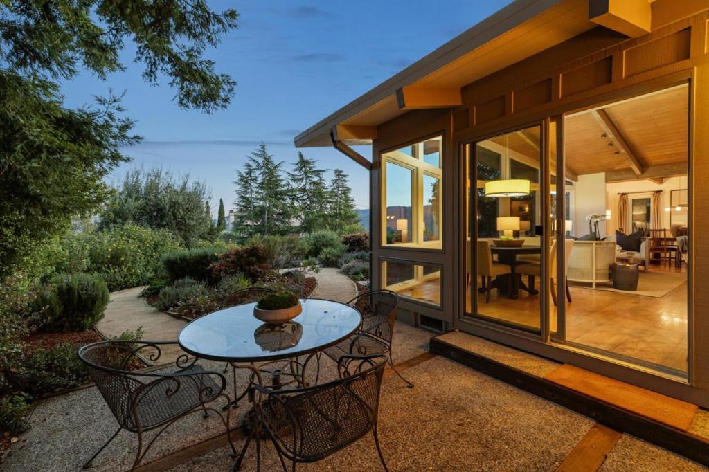 A Private Setting with Sweeping Western Hill Views! Architectural character with a strong connection to the outdoors define this inviting Woodside home set on more than one-third of an acre. Across the front of the home, a dramatic wall of glass rises to a beamed and paneled cathedral ceiling, framing sweeping western hill views and tranquil garden outlooks. Living, dining, and kitchen spaces come together in a generous open area that extends out to a crushed stone patio oriented to the views. Three bedrooms and two baths are arranged for comfort and privacy. The primary suite is positioned just off the foyer and opens directly to the rear yard. Two additional bedrooms are located on the opposite side of the home, including one with an adjoining office or art studio and direct outdoor access. The grounds offer expansive gardens, a level lawn, and a detached studio with flexible use, creating inviting spaces for relaxation, creativity, or entertaining. A close-in setting near the center of town, along with access to highly regarded Woodside Elementary School, completes the appeal of this distinctive property.
