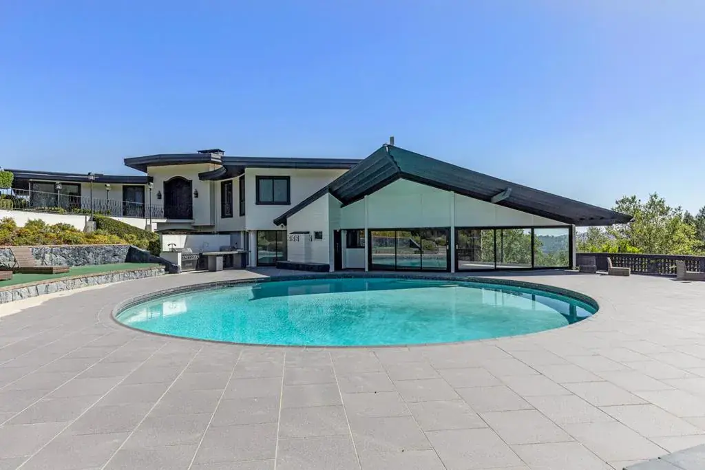7.7 gated acres with Views, Pool, Tennis Court, & Guest house. Bordered by Thornewood Open Space Preserve, and with incredible San Francisco Bay and western hill views. Main home with dramatic formal rooms, walls of glass, and tile or hardwood floors. Sleek modern kitchen with oversized island seating. Main level primary suite with views and spa-like bath plus secondary suite. Lower-level recreation room, customized wine cellar room, plus two beds and bath. Partially enclosed hallway to the pool house with oversized bar, fireplace, 1.5 baths, and retractable glass doors fully opening to the pool. Detached guest house/ADU with full kitchen and bedroom suite plus separate fitness studio. Large circular pool, tennis court, stainless-steel outdoor kitchen, Pinot Noir vineyard, and vast level lawn. Portola Valley schools and direct access to miles of open-space trails.