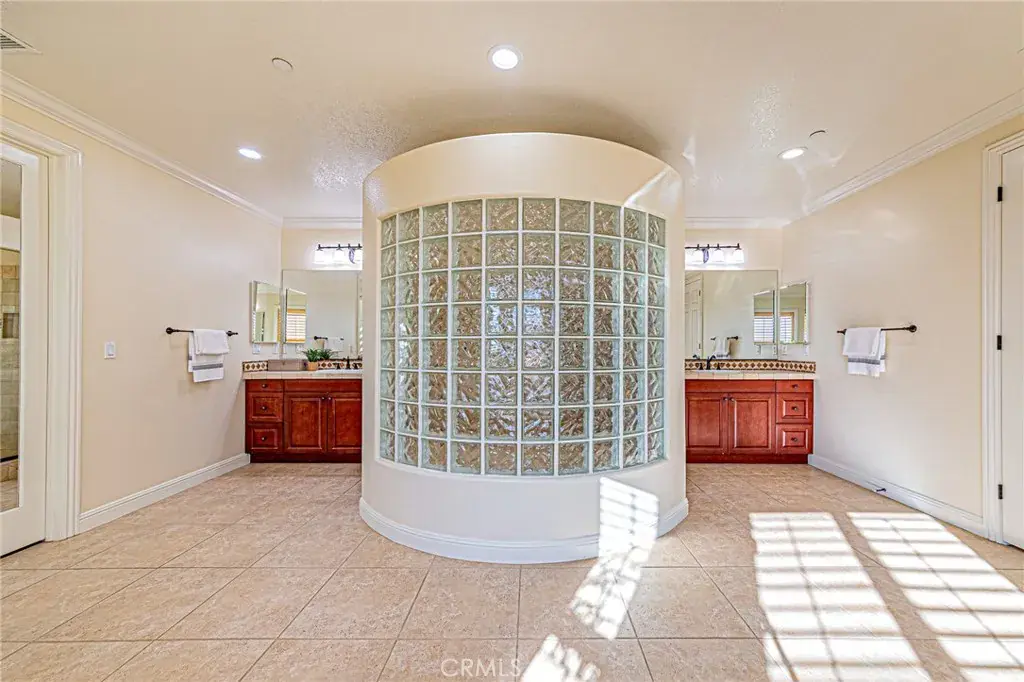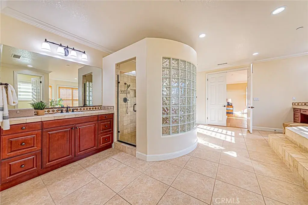 The primary suite is a true retreat with a spa-like bath, soaking tub, dual vanities, and breathtaking views.