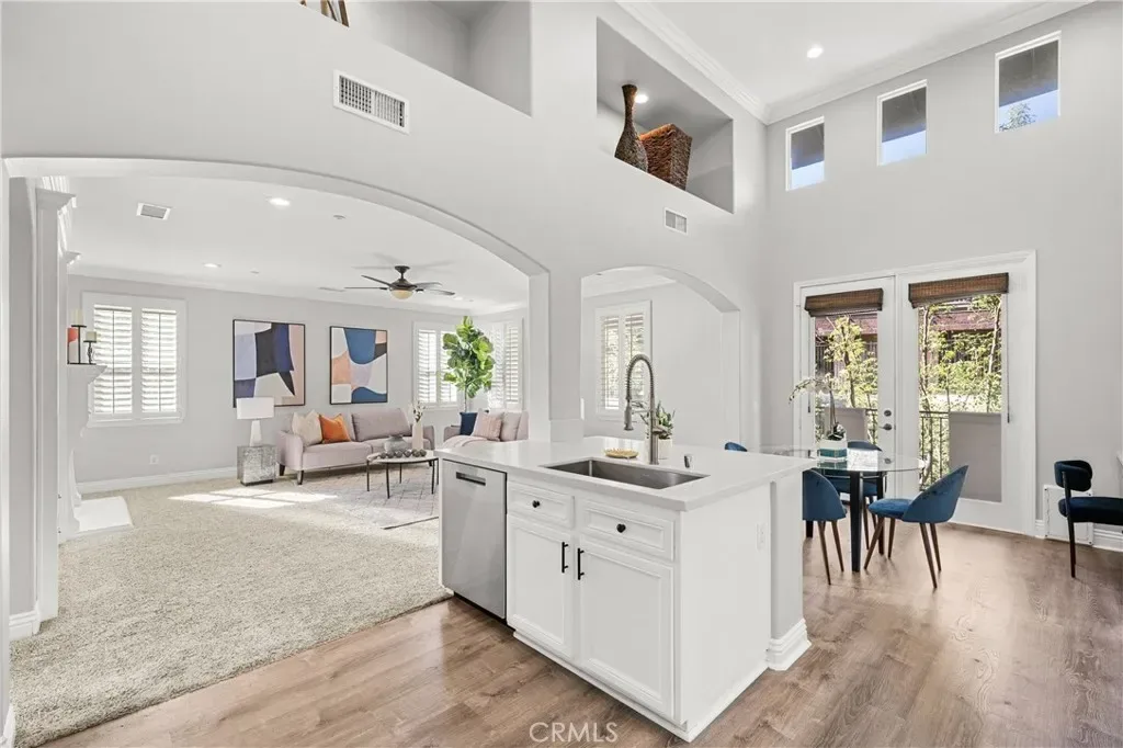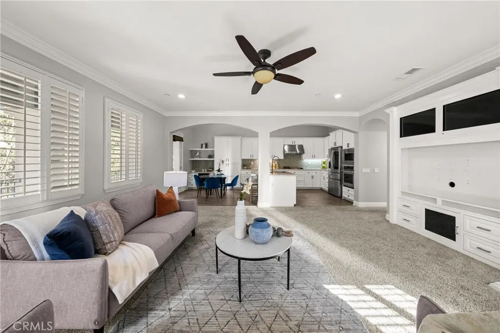 Pristine luxury retreat located in the highly sought-after golf course community of San Lorenzo. This bright and airy home offers 3 bedrooms plus a versatile bonus room, 2.5 bathrooms, and approximately 2,615 sq. ft. of thoughtfully designed living space with an open-concept layout. The inviting living room serves as the heart of the home, highlighted by a beautiful fireplace with a custom-built mantel and entertainment center. The stunning gourmet kitchen features tile backsplash, granite countertops and stainless steel appliances. A convenient breakfast bar is perfect for busy mornings, while a built-in desk provides an ideal workspace. The kitchen seamlessly connects to a covered balcony deck, making outdoor BBQ and entertaining effortless. The formal dining room is enhanced with elegant custom wainscoting and comfortably accommodates gatherings of up to 12 guests. The spacious primary suite features soaring ceilings and an overhead ceiling fan, creating a relaxing private retreat. The luxurious primary bathroom includes a dual vanity, soaking tub, walk-in glass shower, and an oversized walk-in closet. Residents of this community enjoy access to resort-style amenities including a pool, spa, BBQ area, and clubhouse for private gatherings. Ideally located just minutes from Yorba Linda High School, Yorba Linda Town Center, and nearby horse, hiking, and walking trails. This exceptional move-in ready home offers comfort, style, and convenience—an opportunity you won’t want to miss.