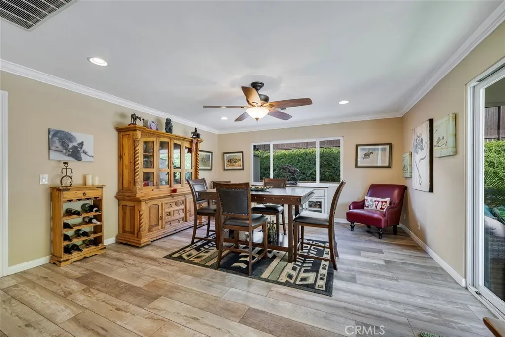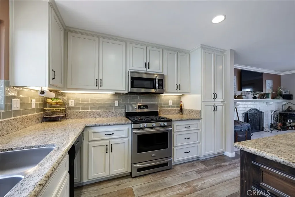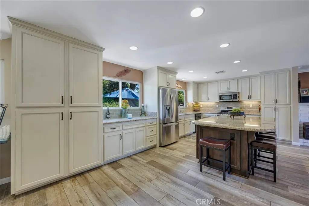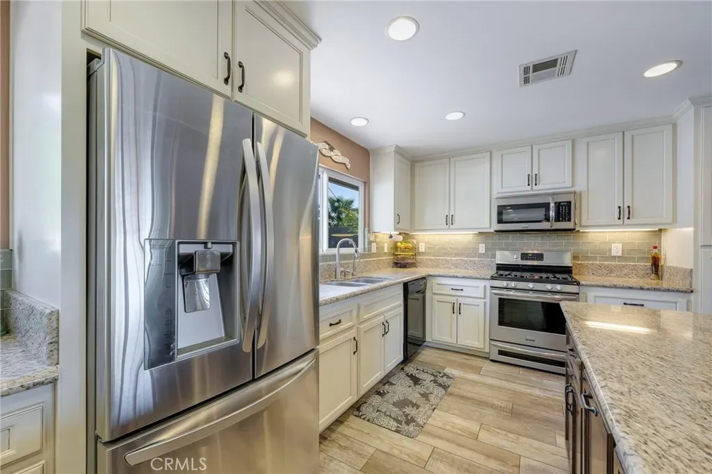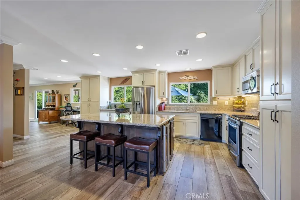 The chef’s kitchen is the centerpiece of the home, featuring a large island, dual pantries, granite countertops, tile backsplash, stainless steel appliances, wine refrigerator, and insta-hot faucet. Milgard windows throughout bring in natural light while enhancing energy efficiency and comfort. Additional upgrades include plantation shutters, crown molding, recessed lighting, and ceiling fans.