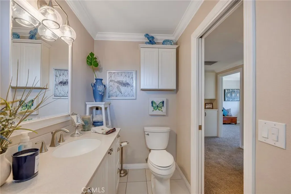 Upstairs, the expanded primary suite offers a peaceful retreat with a private balcony showcasing stunning sunset and city light views, a walk-in shower, marble-topped vanity, and two closets including a walk-in. A secondary bathroom features a shower over a jetted tub, ideal for family or guests.