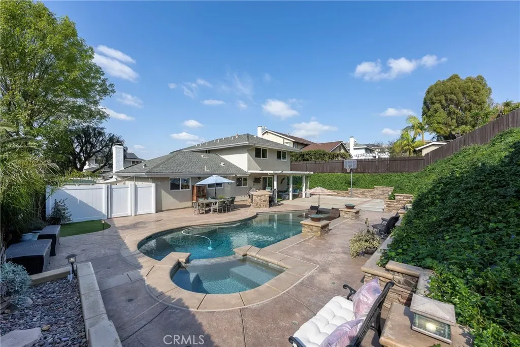 Perched at the top of Fairview Estates, this home delivers the ultimate backyard lifestyle with breathtaking panoramic views, exceptional privacy, and resort-style amenities. The expansive outdoor space is designed for both relaxation and recreation, featuring a saltwater pool and spa with waterfalls and copper fire pots, a built-in Jenn-Air barbecue island, Alumawood patio cover, private viewing platform, and a basketball court, a rare and highly sought-after addition that elevates the entire property.