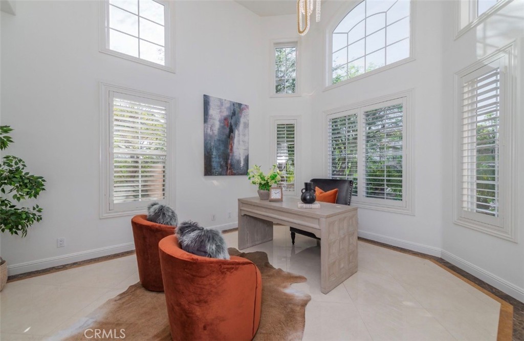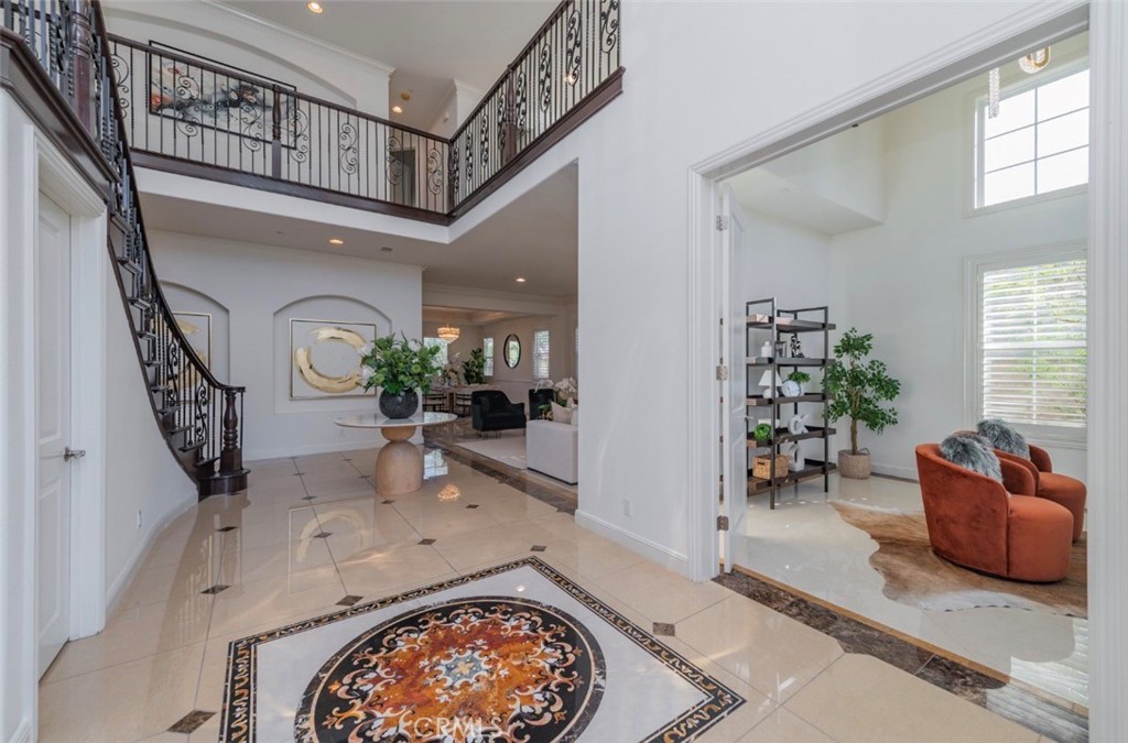Introducing this property built by renowned builder Toll Brothers in a prime location at Vista Del Verde community in Yorba Linda. Also close to Black Gold Golf Club– a lifestyle of convenience, health,and leisure. The school district is well-know as Placentia and Yorba Linda. Upon entry, you are welcomed by a stunning high ceiling foyer with an open and airy layout, next to the entry is a separate formal reception room or a private home office. The main floor features expansive classic-pattern tiles flooring, complemented by a grand crystal chandelier above,creating a luxurious and sophisticated ambiance.