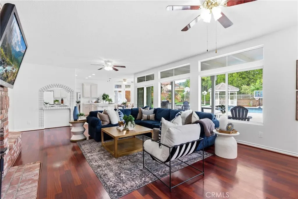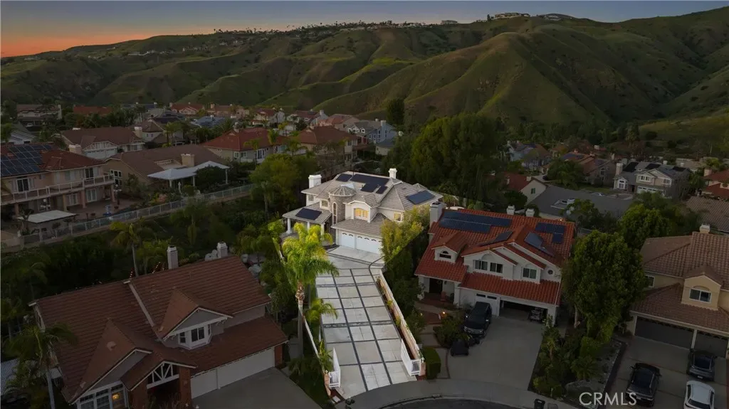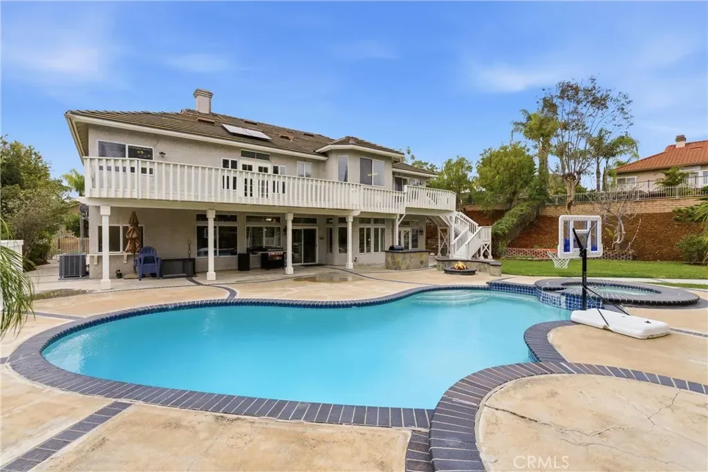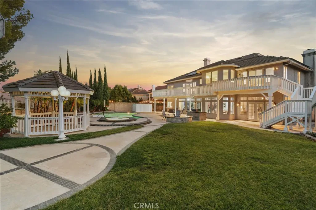 Nestled at the end of a cul-de-sac in Bryant Ranch, this gated estate offers a rare combination of privacy, space, and refined living on a generous 18,000 sq ft lot. Featuring a resort-style backyard, flexible living spaces across both levels, and top-rated schools just minutes away, this is a home built for both everyday comfort and year-round entertaining. A long, private-gated driveway welcomes you to the striking 5 bedroom, 4.5 bath residence. Custom wrought-iron double doors open to a soaring two-story foyer with a dramatic, sweeping staircase and chandelier. Formal living and dining rooms flow naturally to the outdoors. In the family room, a large brick hearth fireplace and built-in bar create a comfortable gathering space that connects to the kitchen and eat-in breakfast area, all overlooking the backyard. The main level also hosts a private home office featuring French doors to the exterior, a dedicated laundry room, and a full bedroom suite with en suite bath, ideal for guests or multigenerational living. Upstairs, the primary suite is a true retreat with vaulted ceilings, a sitting area, private fireplace, and coffee bar. The en suite bath delivers a spa-like experience with an oversized jacuzzi tub, walk-in double shower, dual vanities, and two walk-in closets. French doors open to an expansive deck overlooking the backyard and rolling hills beyond. Down the hall, a versatile upstairs living area also opens to the deck, with stairs leading directly to the pool and patio. A junior suite with its own en suite bath and two additional bedrooms sharing a Jack-and-Jill bath complete the upper level. The backyard is your own private oasis. Covered patios give way to a sun-drenched pool and spa surrounded by lush mature landscaping. A picturesque gazebo, water features, a built-in fire pit, and an outdoor BBQ kitchen create natural gathering points for every occasion. Grassy lawns, manicured paths, and a basketball court are all framed by mature trees and hardscape that enhance the sense of total seclusion. Zoned for award-winning Yorba Linda High School and less than a mile from Bryant Ranch Elementary, with picturesque Box Canyon park and playground just a half mile away. With its scale, seclusion, and unmatched outdoor living, this home unlocks a sought-after lifestyle.