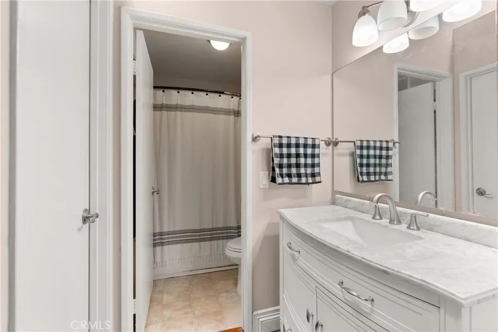 Boasting high-sloped ceilings with a skylight, the primary suite is sure enlighten the senses. Its dressing area is adjacent to the walk-in closet, and a refreshed bathroom with a brand-new vanity, marble countertop, and modern faucet. The second bedroom is generously sized and also includes its own walk-in closet. A full-size shower completes the hallway guest bathroom.