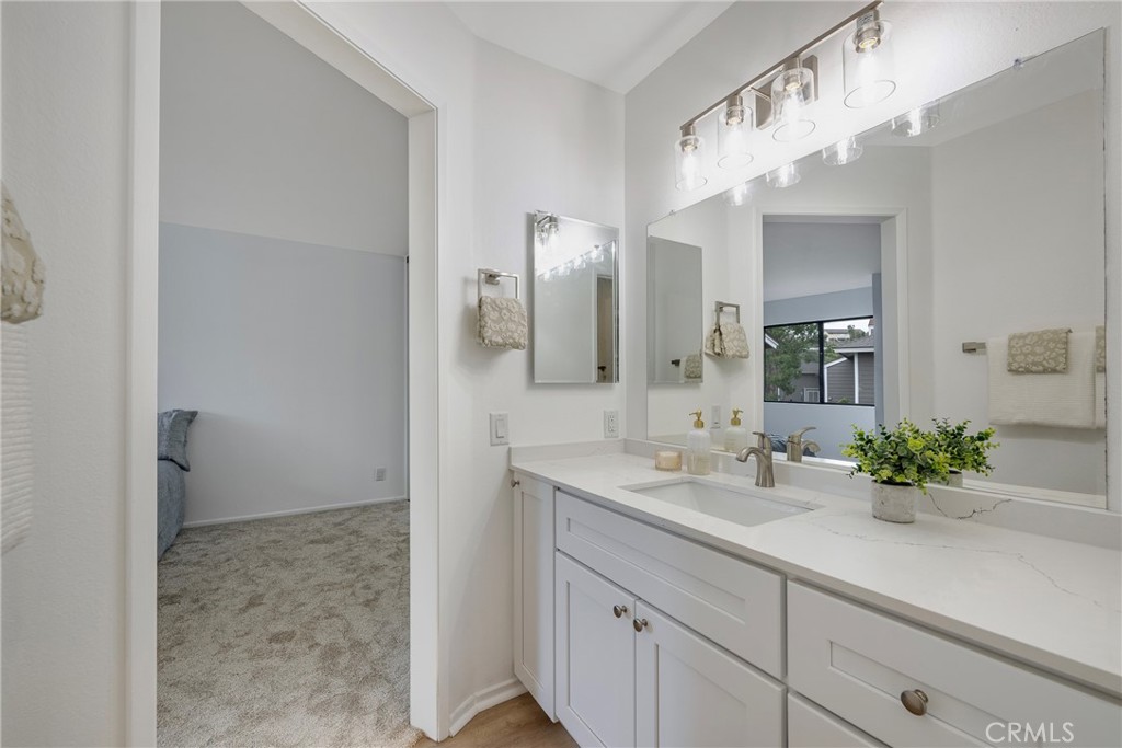 The primary suite includes mirrored closets and a private en-suite bathroom with new vanity, shower tile and door and fixtures. Two additional bedrooms are generously sized and offer flexibility for guests, family, or a dedicated home office. A second full bathroom features a tub/shower combination along with updated fixtures and flooring. Throughout the home, you’ll find fresh interior paint, new carpet in the bedrooms, and vinyl plank flooring in the bathrooms.