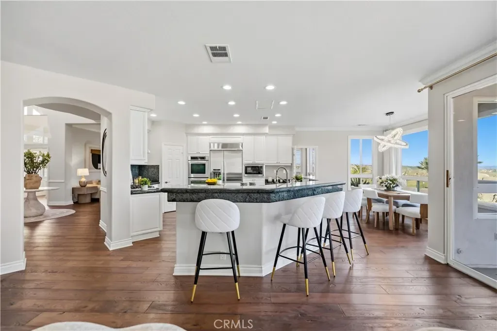 This beautifully upgraded residence offers 6 spacious bedrooms and 5 bathrooms, recently refreshed with new interior and exterior paint, premium carpeting, and updated flooring throughout. The elegant chef’s kitchen features white lacquer cabinetry, granite countertops, a built-in refrigerator/freezer, stainless steel appliances, and a large center island that opens seamlessly to the impressive Great Room with fireplace and stunning picture windows overlooking the views and backyard.