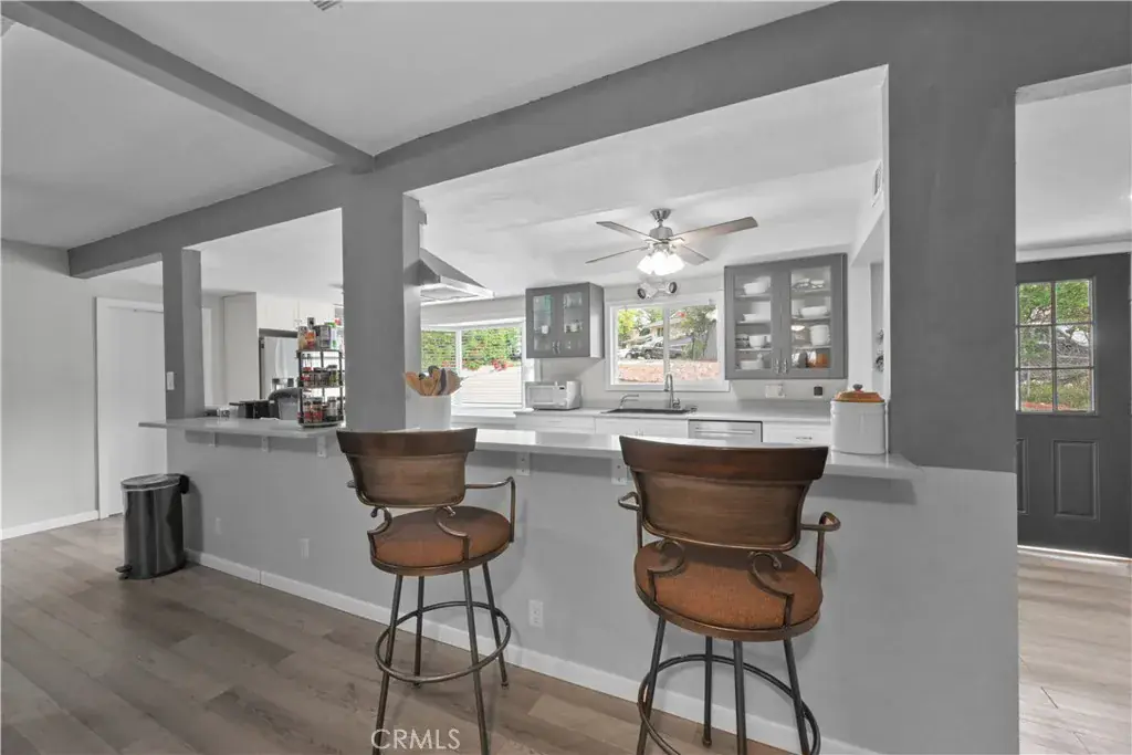 The remodeled kitchen offers abundant counter space, a breakfast bar, quartz countertops, elegant glass-front display cabinetry, a five-burner range with stainless designer hood, and a spacious breakfast nook overlooking an inviting bay window.