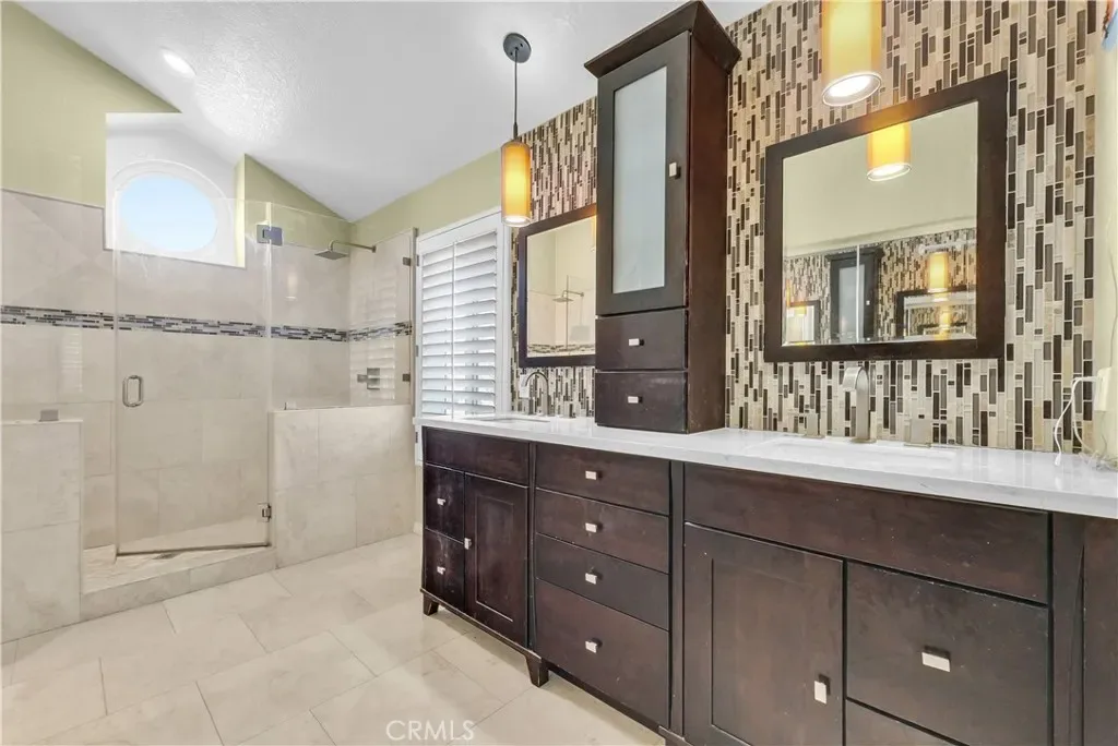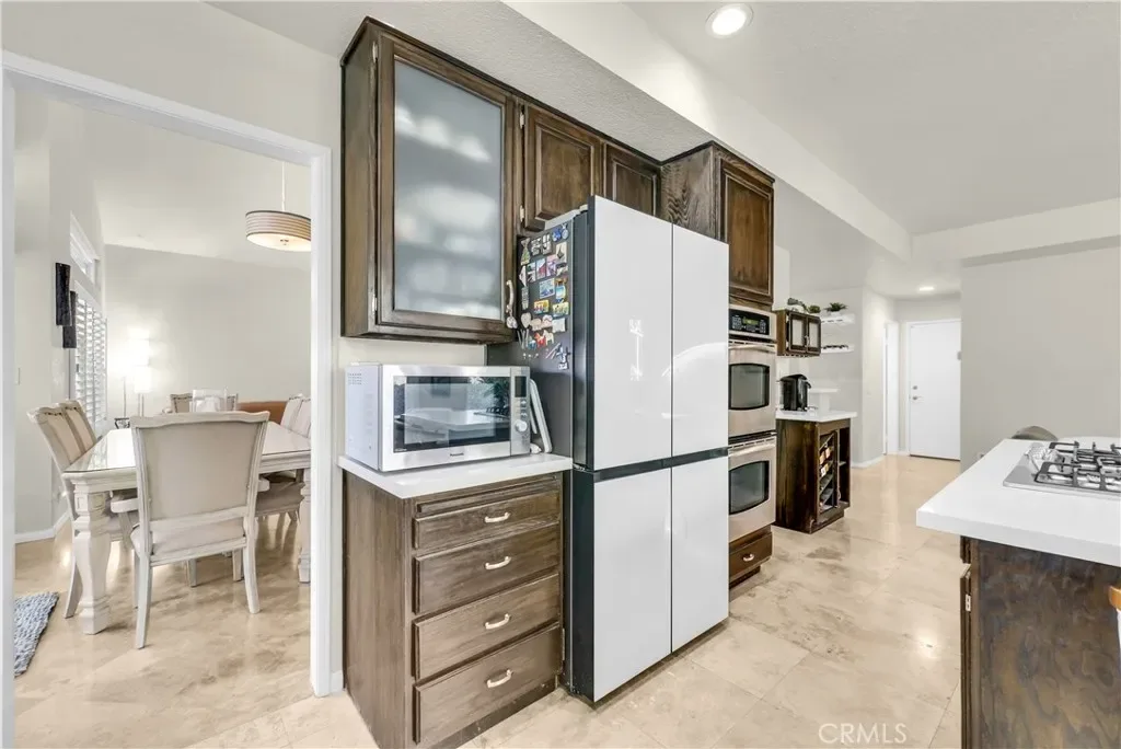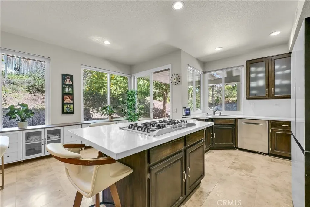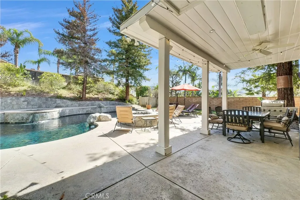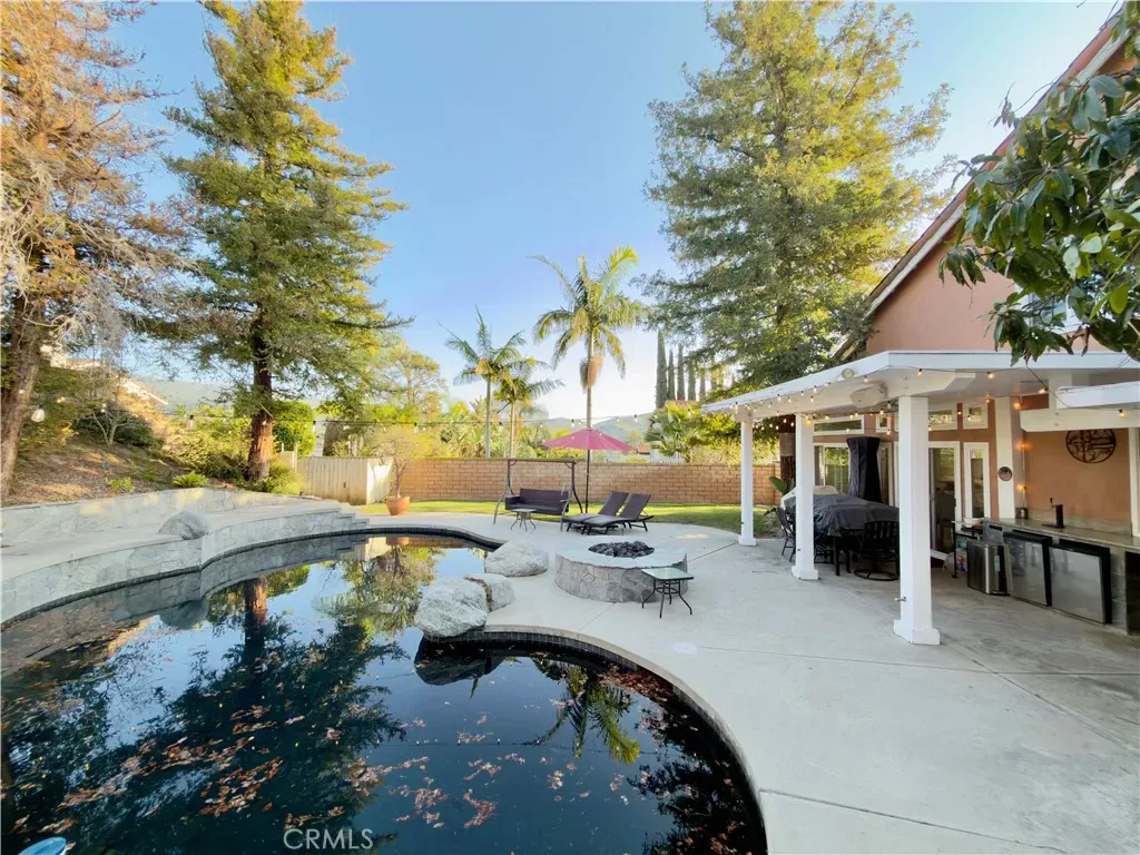 Welcome to this beautifully updated home featuring a freshly painted exterior, newer roof, newer windows and owned solar which reduces the electric bill. As you arrive, you’re greeted by a large front yard and covered patio, perfect for relaxing. Inside, the home offers 4 spacious bedrooms, the first floor bedroom which is being used as an office can easily be made back to a bedroom and the first floor nearby remodeled bathroom offers a bidet and modern floating vanity. The primary suite is filled with natural light from numerous windows and features a stylishly updated contemporary bathroom and walk in closet. Step into the main living space with travertine flooring and soaring vaulted ceilings, creating an open and inviting atmosphere. The kitchen is designed for both everyday living and entertaining, featuring beautiful quartz countertops, a large island with cooktop, double ovens, and a spacious pantry closet. An entertaining bar with quartz countertop provides the perfect gathering space for family guests. The backyard is truly an entertainer’s dream. Enjoy a covered patio with surround sound speakers, multiple fruit trees, and a stunning waterfall into the saltwater pool and spa with a lagoon-style color. Additional highlights include a newer pool pump, large fire pit, and outdoor bar area, making it ideal for hosting gatherings year-round. Tall pine trees and beautiful backyard views complete this private outdoor retreat. Conveniently located close to schools, shopping, restaurants, and easy freeway access, this home offers the perfect blend of comfort, style, and convenience.