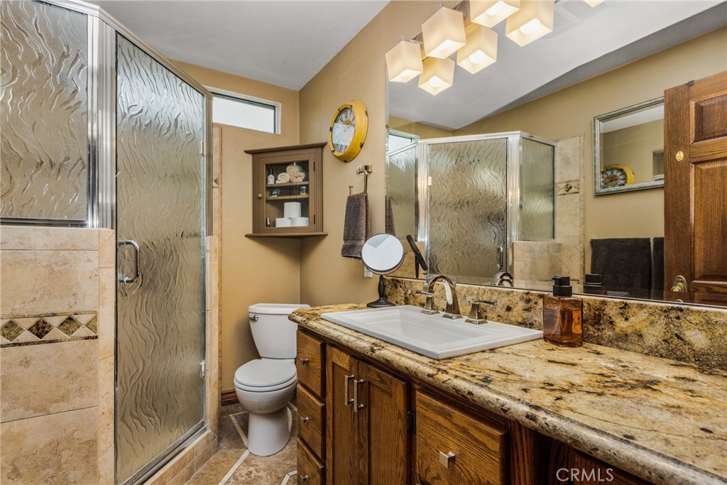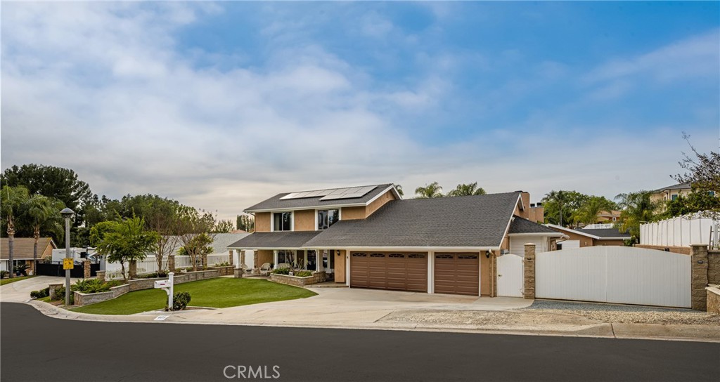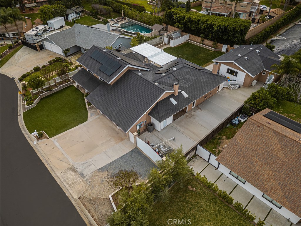 This 5 bed, 3 bath home with a 2 bed 1 bath ADU and RV parking on an oversized lot with solar panels is perfect for multigenerational living and is in one of Yorba Linda’s most desirable neighborhoods! Main lives like a single level with the primary suite, two bedrooms/one bath on the first floor and two beds/one bath upstairs. The detached ADU offers potential for income, and the RV driveway has electricity and dump station. For those warm Summer nights, the extended roof patio spans the front of the home and your lawn will always look mowed with the manicured artificial turf. The RV gate is 17 ft wide and the driveway is over 60ft long and 18ft wide from eves to wall along side the 3 car garage. Inside, views to the backyard, vaulted ceilings, and a warm wood floor greet you. The classic kitchen is beautifully appointed with top-of-the-line appliances including a Sub Zero refrigerator, Dacor 5 burner stove, Miele double ovens and warming drawer, Kitchenaide stainless dishwasher and fridge with panel doors matching the cherry cabinets with beading. A Farmhouse sink and solid maple pullout drawers including a spice rack, and two lazy Susans with many soft close drawers make this kitchen as functional as it is beautiful. The spacious island showcases Splendor granite, a separate sink and seating for three. The ample cabinetry also offers a coffee cabinet and Splendor backsplash diamond cut outs. An abundance of lighting tops it off. The large dining area can accommodate a 12 ft table and has fireplace. Everyone will come hang out in the huge room with the stone covered fireplace and hearth. The windows and the sliding glass door to the outdoor kitchen bring lots of light. Built in cabinets and desk span one whole wall. Step out to the patio where you’ll find an outdoor kitchen that was recently constructed with concrete counters, a Blaze BBQ, 2 burner stove, sink and garbage disposal. Green grass, avocado trees, and the ADU are surrounded by concrete and slump stone walls. The 920 foot ADU hosts 2 bedrooms and 1 bath with kitchen overlooking a very spacious gathering area, and outside is a gated artificial turf yard. Step back into the primary room doors in the main house to find a spacious room with a wall of closets, walk in shower in the primary bath and down the hall 2 bedrooms with wood floors and the hall bath with tub. Up stairs you’ll find 2 more bedrooms and a hall bath with a shower. Shopping, theatre, Yorba Linda lakebed and great schools.