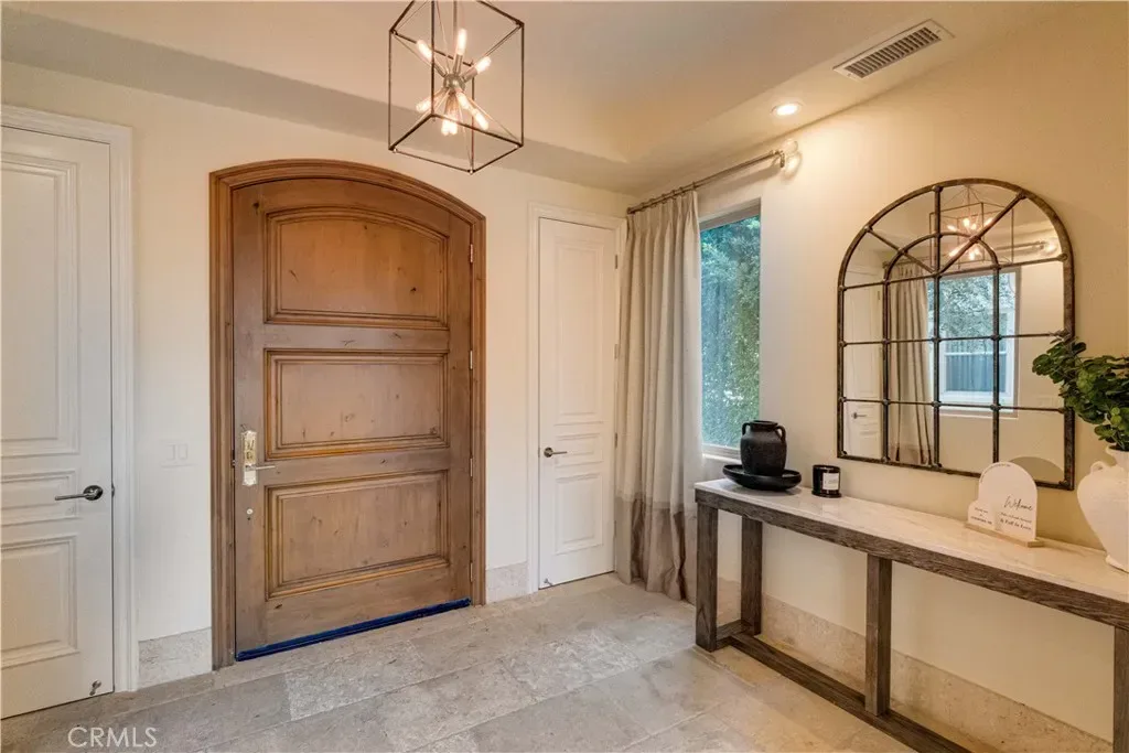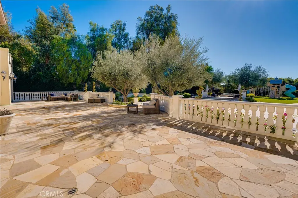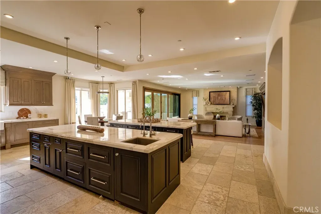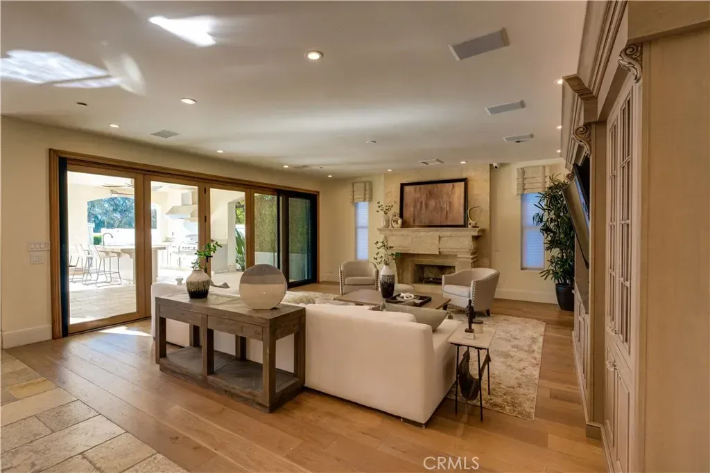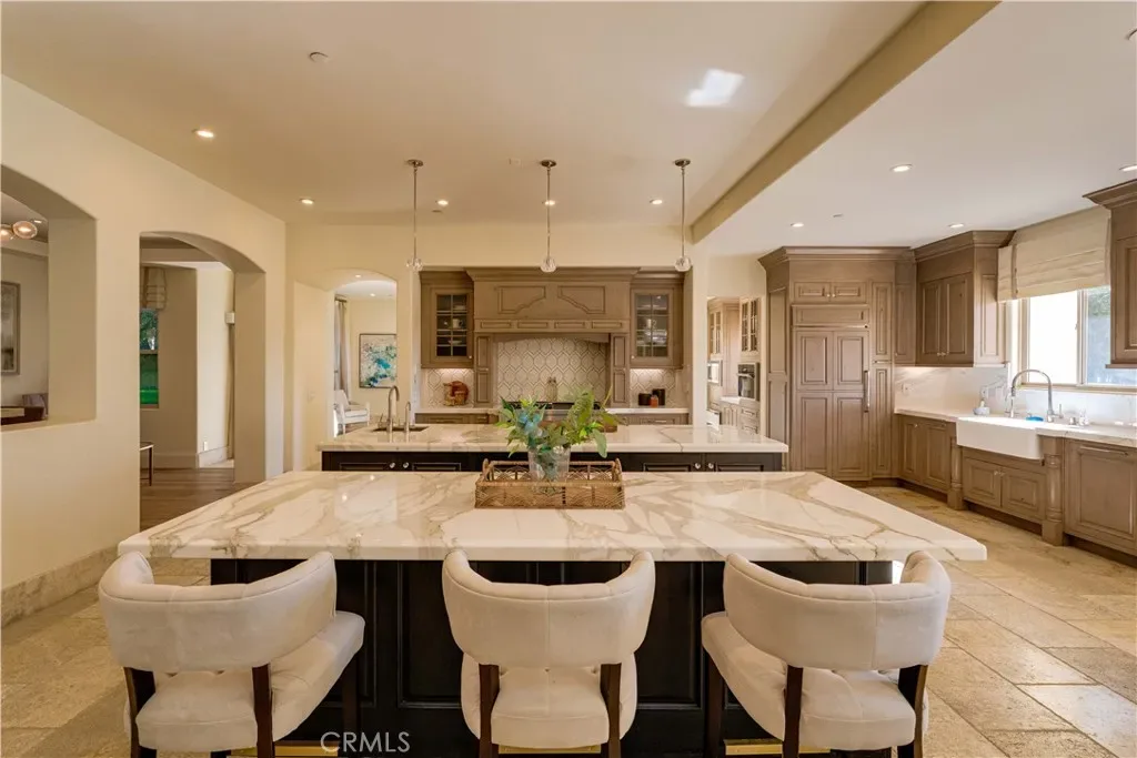The thoughtfully designed backyard is ideal for both entertaining and everyday enjoyment, featuring a resort-style pool, landscaped outdoor spaces, a children’s playground, and a separate guest house/ADU offering flexible living options. Inside, the home showcases timeless architecture with a spacious and functional floor plan. Natural travertine stone flooring flows throughout, complemented by elegant natural stone countertops and refined finishes. Each living space is generously proportioned, blending comfort with understated luxury.